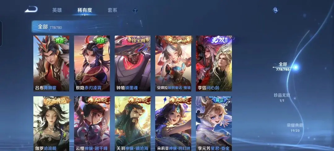 目前皮肤数量782,新出皮肤第一时间都会买,安琪拉典藏/李信无双限定/马年限定全套/伽罗珍品传说孙悟空-无相杨戬-纵目迁山曹操-万灵伏威凯无双限定神罪干将莫邪千山共赴/元歌诡秘之主/诡秘之主大司命死亡执政官/弈星守夜人/诸葛亮无双天机白泽/司马懿九山相柳/宫本黑崎一护/暃朽木白哉/貂蝉馥梦繁花珍品无双/三丽鸥联动/安琪拉库洛米之心/瑶大耳狗之梦/张飞珍品传说芈月瑰影绮梦狄仁杰绮世丹青蛇年限定套伽罗典藏曜无双嫦娥珍品传说已补。