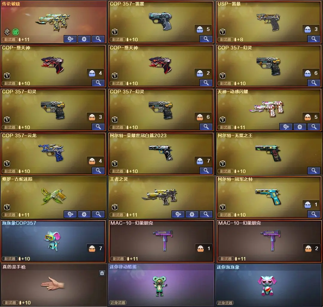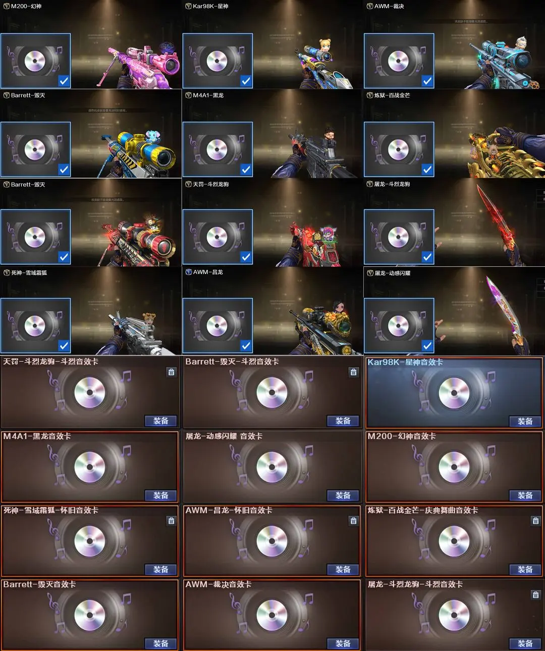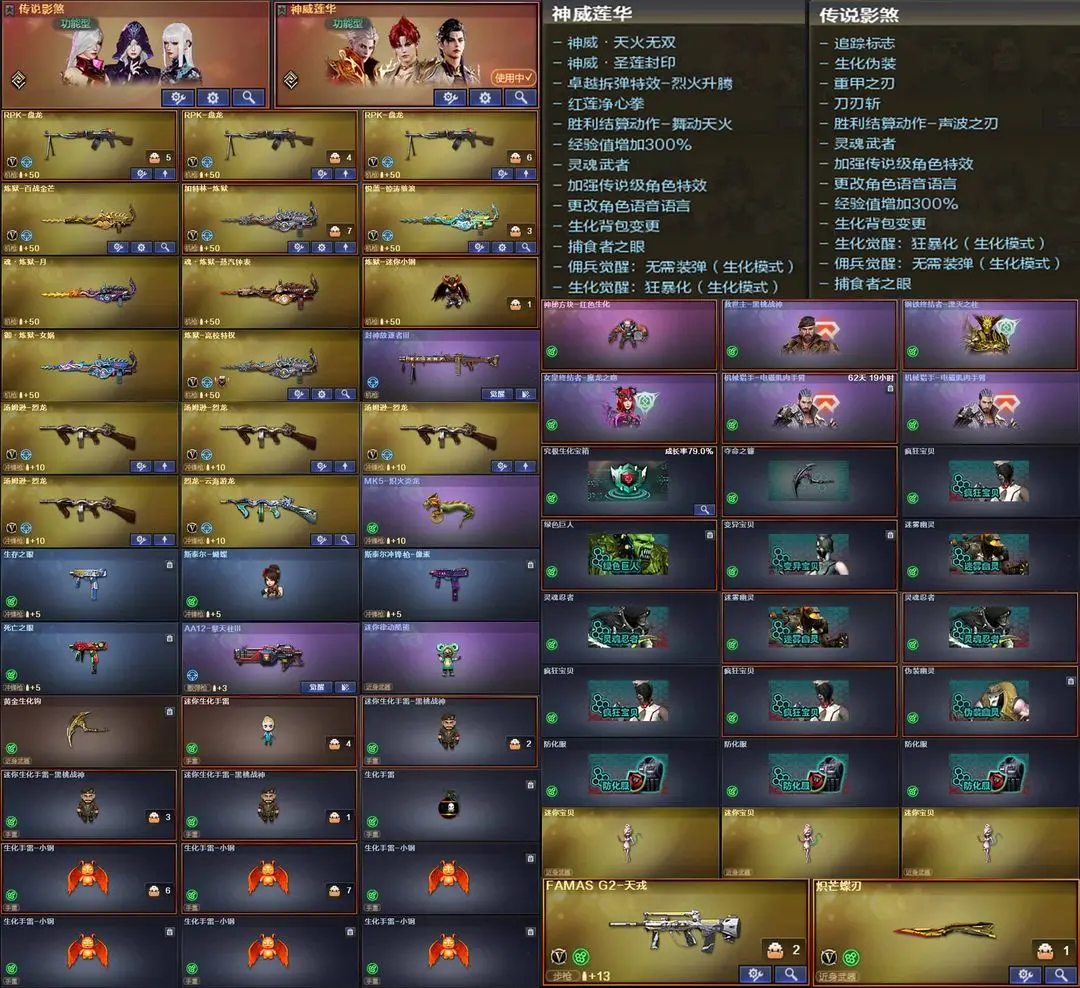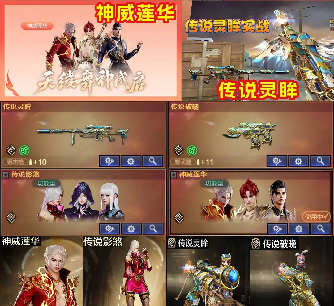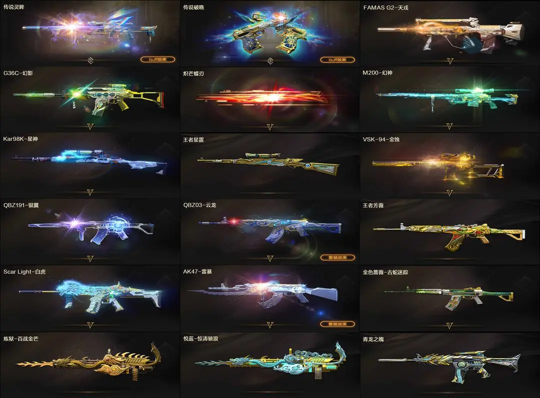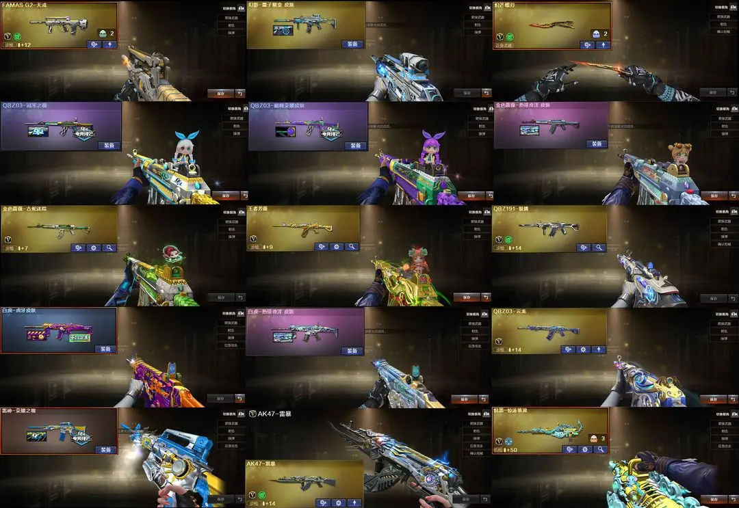 【装备道具】:传说影煞、神威莲华、传说灵眸、传说破晓★幻神-宠儿-2021MVP、幻神-冠军之幻、M200-幻神-N9-2022MVP/星神-璀璨、星神-漫游、Kar98K-星神-冠军之星/白虎-虎牙/幻影-量子聚变/QBZ03-冠军之薇、QBZ03-巅峰荣耀、金色蔷薇-热带奇洋白虎/雷神-R.LGD-CFPLS18冠军、雷神-荣耀之魄、雷神-HeartShot/★FAMASG2-天戎、炼狱-百战金芒、VSK-94-金蚀、G36C-幻影、Scar-白虎、QBZ191-银翼游侠、QBZ03-金色蔷薇、QBZ03-云龙、王者星霆、青龙之魄、王者芳薇★晴雅、华、司雨、机械姬、雨墨、关小雨、鹰、影豹、迷迭香、炫★COP357-雷霆、COP357-幻灵、COP-堕天神、COP357-云龙、USP-雷暴、柯尔特-冠军之特、白鲨柯尔特-无冕之王★斯泰尔-蝴蝶、MK5-炽火炎龙、悦蓝-惊涛骇浪炼狱-迷你小钢、雷暴套装、堕天神套装、云龙套装★泡泡象COP357、5烈龙/炼狱-百战金芒音效卡、屠龙音效卡、黑龙音效卡、幻神音效卡、星神音效卡、毁灭音效卡、裁决音效卡、
