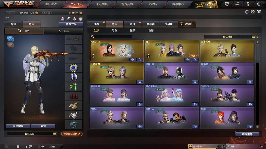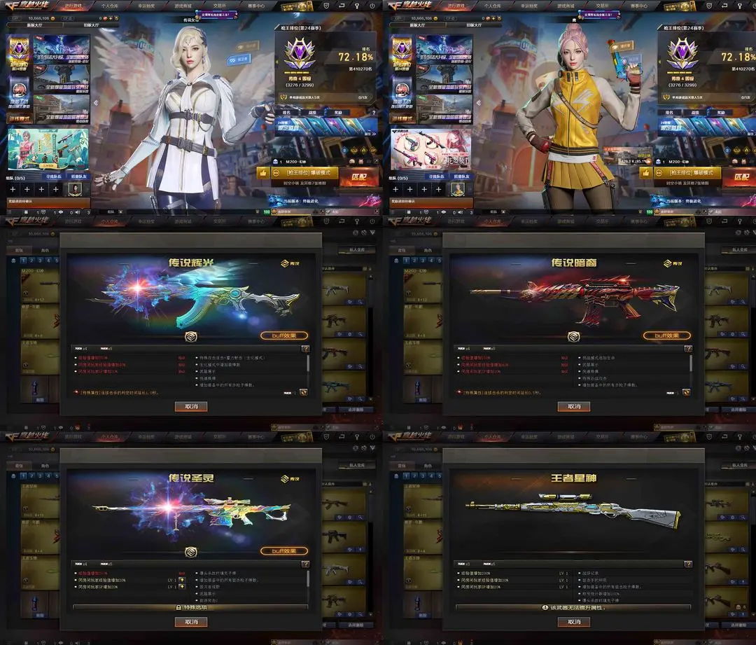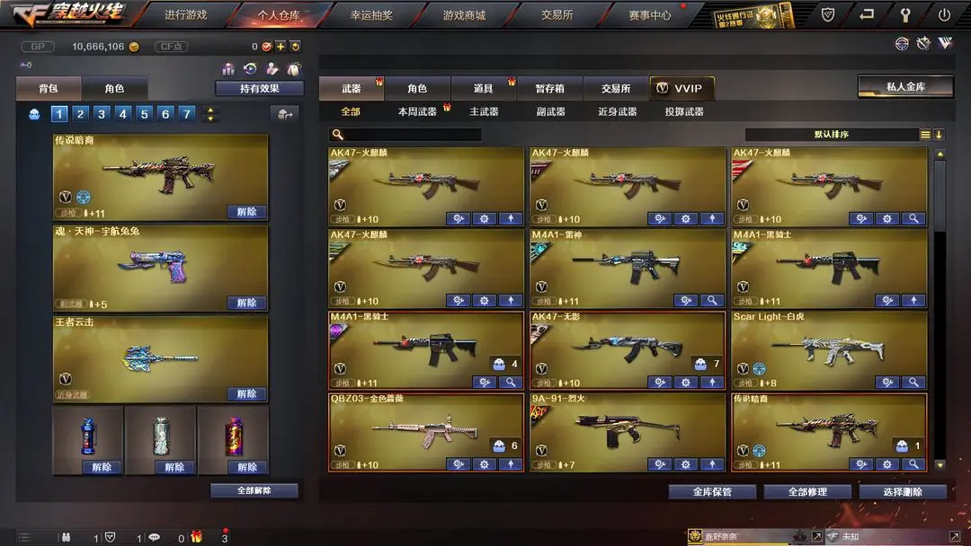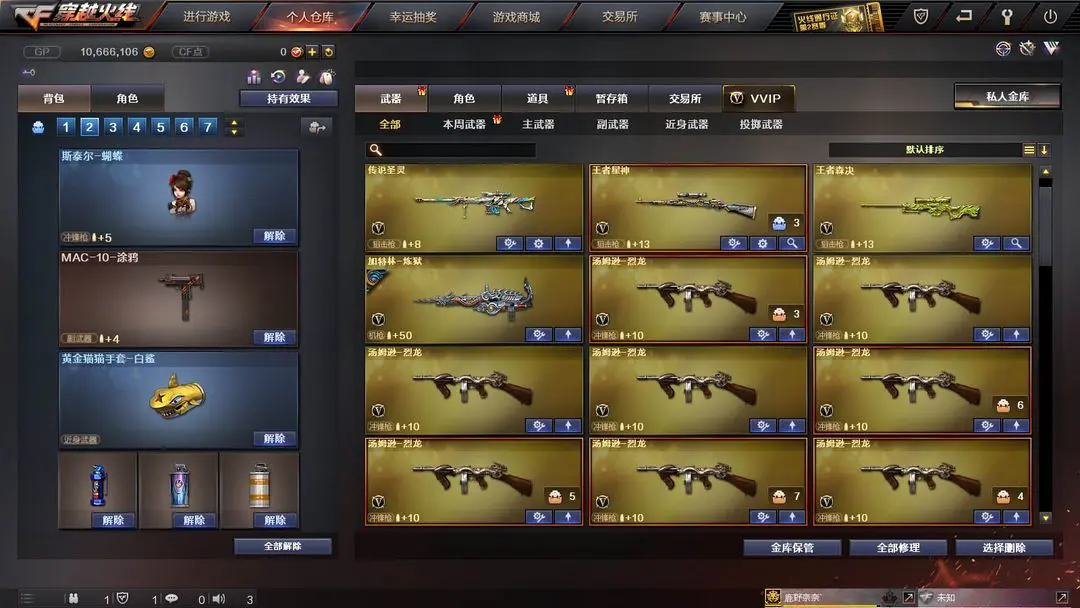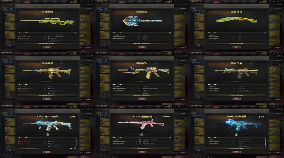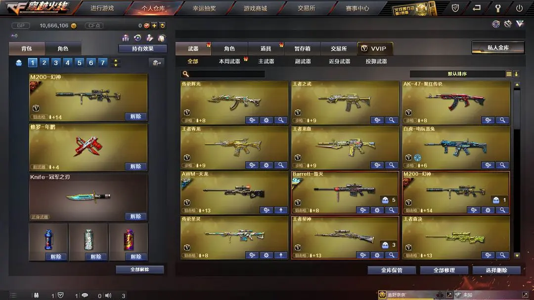 【装备道具】:Knife-冠军之刃★传说女帝★鹰★传说辉光★传说暗裔★传说圣灵★丹凤幻神皮肤★黄忠幻神皮肤★幻神音效卡★M200-幻神★觉醒王者星神★觉醒王者云击★觉醒王者森决★觉醒王者玉锋★觉醒王者青龙★觉醒王者龙血王者之武王者之之刺★王者玲珑★王者凌霄★幻神音效卡★毁灭音效卡★火麒麟音效卡★黑骑士音效卡★黄忠五虎上将战神皮肤★幻神黄忠★M4A1-战神赵云★黑骑士-战神马超★毁灭-战神张飞★火麒麟-战神关羽★火麒麟-枪娘凯萨林★毁灭青帝★雷神机甲刑天★烈火熔岩★火麒麟轻羽皮肤★毁灭星空皮肤★炼狱玩具皮肤★无影霓裳★荆棘玫瑰★灵动武士★白虎电玩蓝兔★SCAR-白虎★QBZ-金色蔷薇★炫金火麒麟★炫金武士★水晶宝珠★死亡之眼★黄金猫猫手套-白鲨★7烈龙炼狱★斯泰尔蝴蝶枪★MAC-10-涂鸦★迷你手枪★黄金生化钩★黄金迷你深渊冰龙★黄金迷你裂空之翼★佣兵觉醒手斧镜减速雷★捕食者之眼超级对讲机不退包★超级背包无需换弹查看血量★