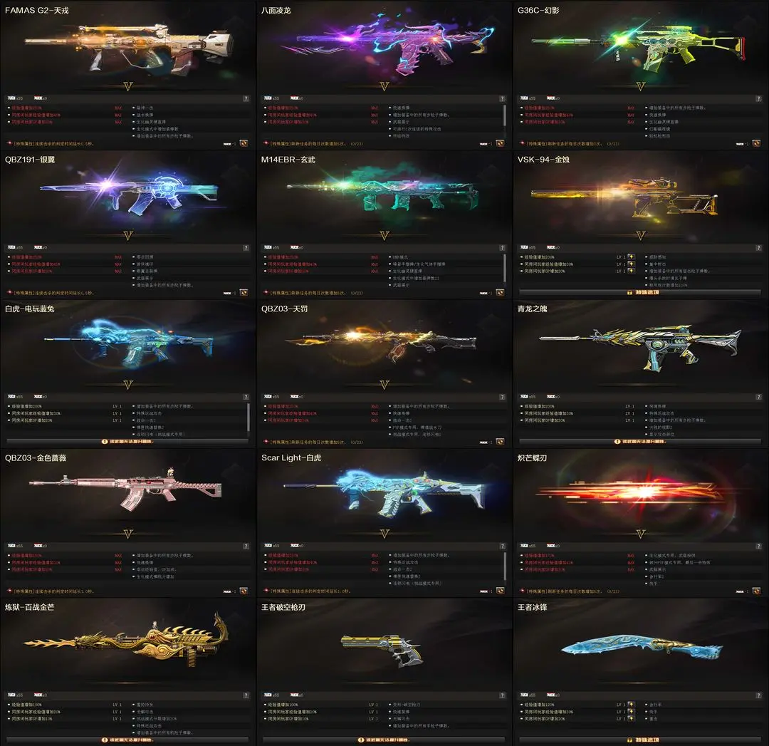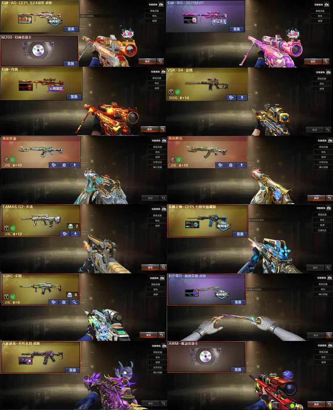 【装备道具】:传说艾莉莎/传说星骇/传说圣谕/传说辉光/传说幽冥/传说破晓★神秘礼盒金色昵称★幻神-AG-CFPL S24冠军/幻神-宠儿-2021MVP/幻神-丹凤/雷神-R.LGD-CFPLS18冠军/雷神-荣耀世冠AG/雷神-宠儿/雷神-荣耀之魄/雷神-虎将/荣耀之魄-CFPL十周年臻藏版/八面凌龙-不朽玄君/白虎-白鲨-CFPLS23冠军/Scar Light-白虎-暗星/白虎-大汉风骨/白虎-电玩粉兔/白虎-霓虹机甲/白虎-AG-CFPLS20冠军/QBZ03-冠军之薇/超新星-兔兔战士/炽芒蝶刃-巅峰荣耀★FAMAS G2-天戎/G36C-幻影/QBZ191-银翼游侠/八面凌龙//VSK-94-金蚀/炼狱-百战金芒/COP 357-雪域霜狐/炽芒蝶刃2把/柯尔特-冠军之特/QBZ03-天罚/Scar-白虎/白虎-电玩蓝兔/M14EBR-玄武/★幻神音效卡/金色蔷薇音效卡/天罚音效卡/白虎音效卡/黑骑士音效卡/裁决音效卡/炼狱-百战金芒-庆典舞曲音效卡/★王者破空枪刃/王者冰锋★荒漠琉璃/月兔特工/雪域霜狐/★佣兵觉醒无需换弹手斧镜减速雷★捕食者之眼查看血量★