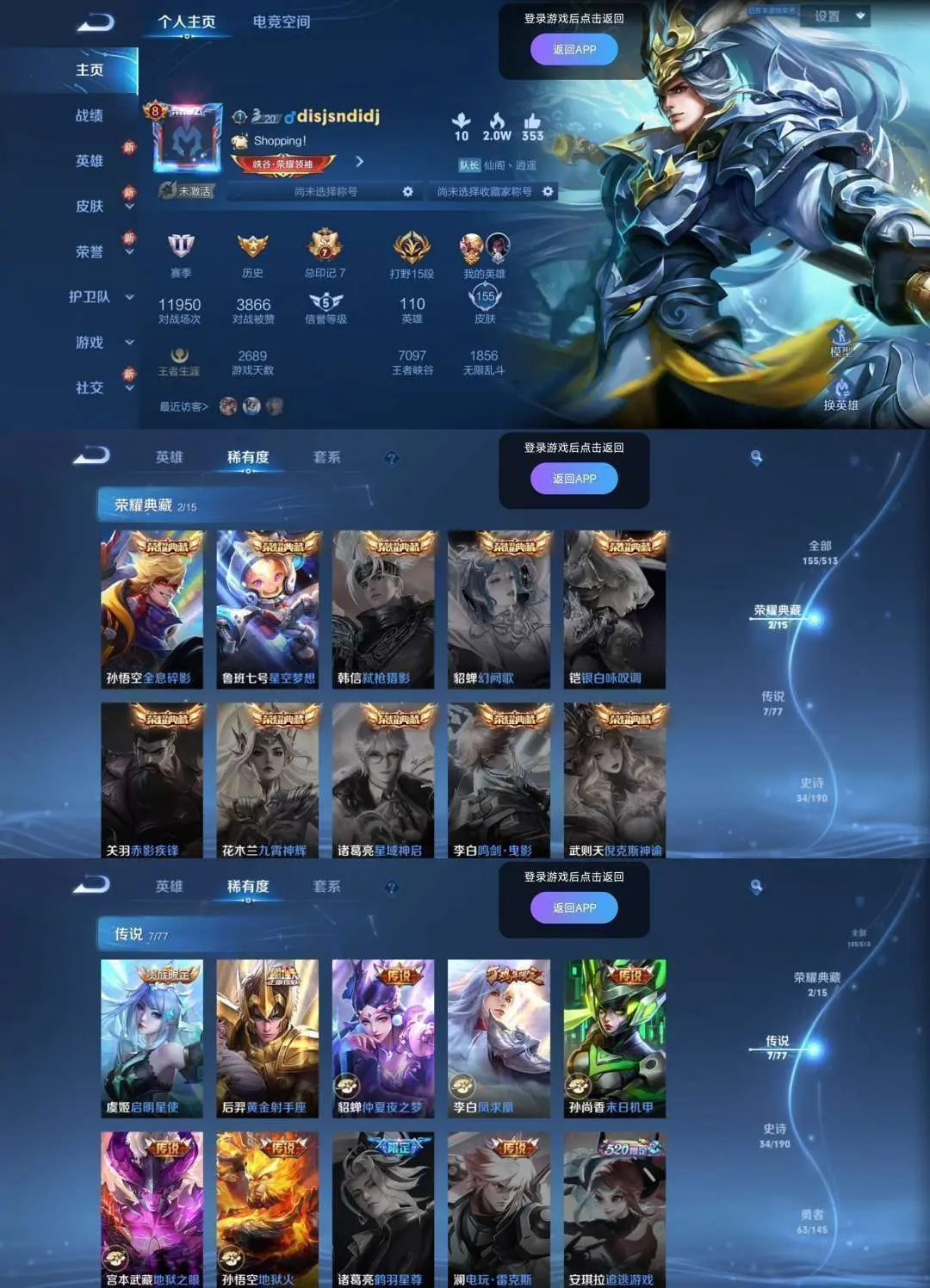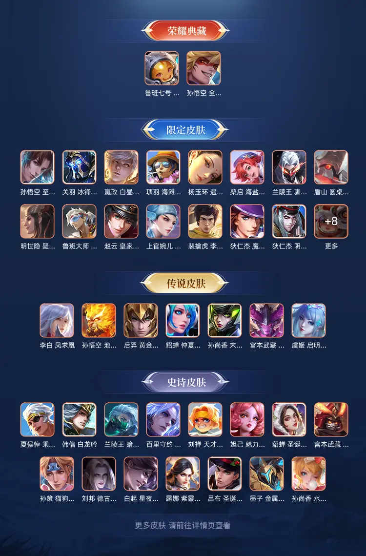 本游戏账号: V7用户,基础段位:永恒钻石I,英雄多,皮肤多。典藏皮肤2个,感受典藏皮肤带来的优质体验快感, 私人所属英雄皮肤有:孙悟空 全息碎影||鲁班七号 星空梦想虞姬 启明星使||后羿 黄金射手座||貂蝉 仲夏夜之梦||宫本武藏 地狱之眼||李白 凤求凰||孙尚香 末日机甲||孙悟空 地狱火,等等