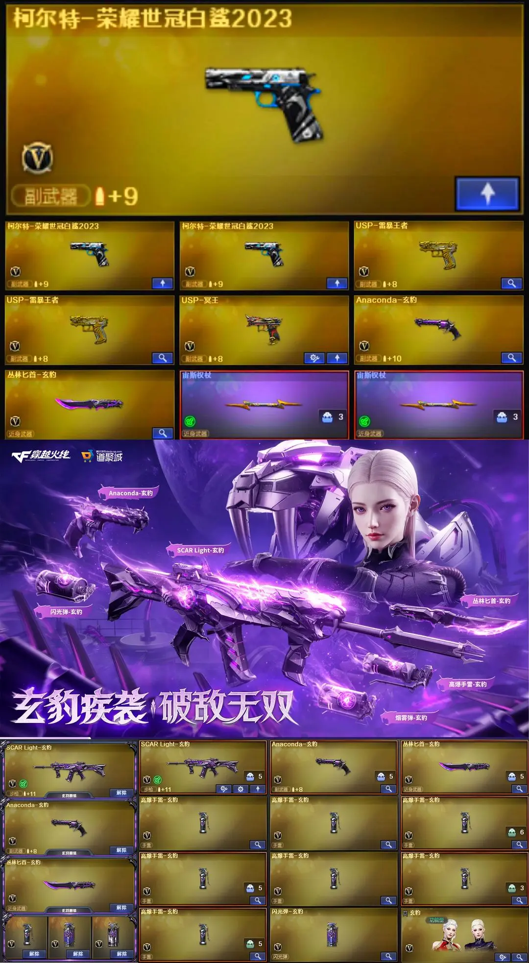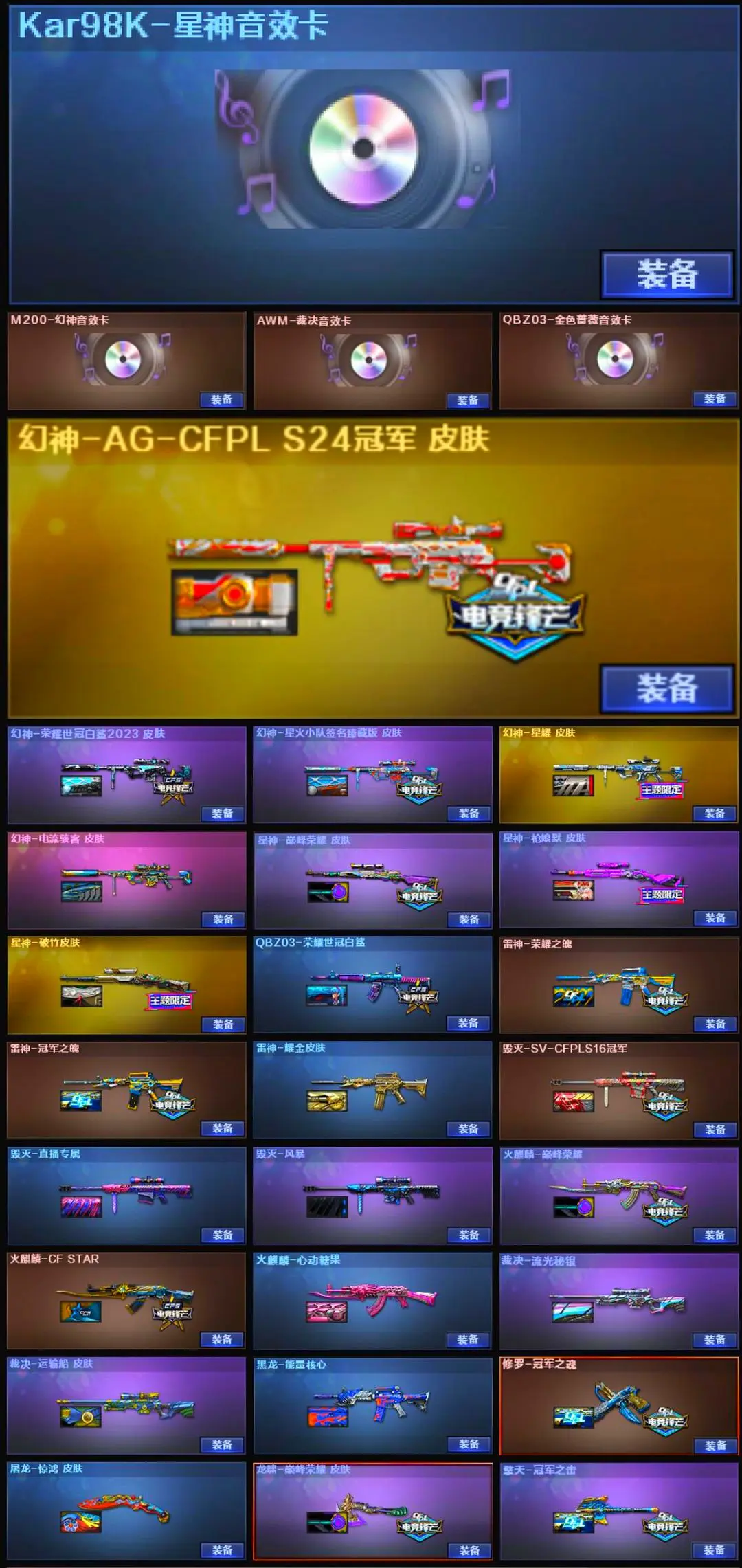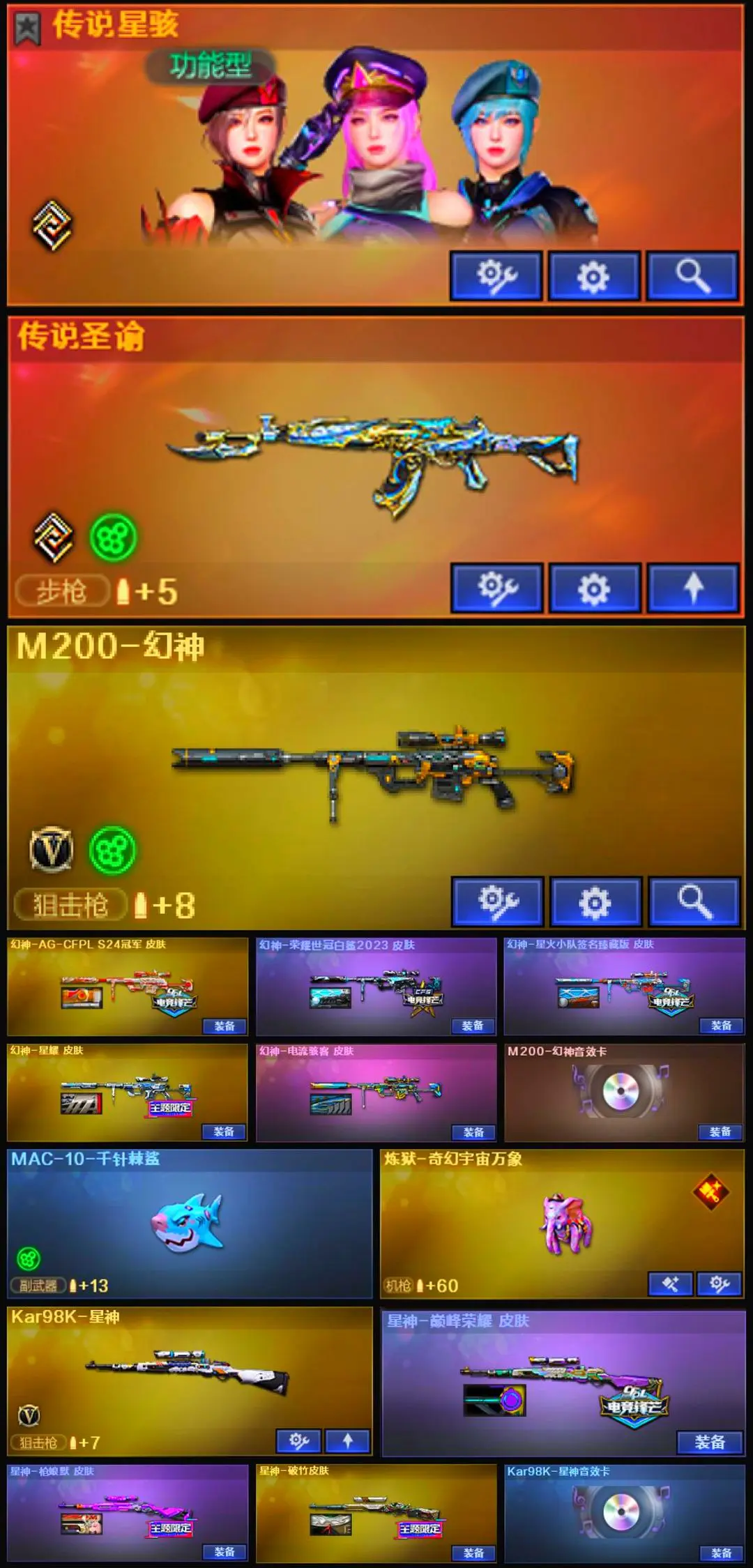 【装备道具】:【幻神三件套】【幻神4皮】【星神三件套】【裁决三件套】【6烈龙】【斯泰尔-枪娘暗刃】【6盘龙】【炼狱-秦师】【传说星骇】【传说圣谕】【M200-幻神】【幻神-AG-CFPL S24冠军】【幻神-荣耀世冠白鲨2023 皮肤】【幻神-星火小队签名臻藏版】【幻神-星耀】【幻神-电流骇客】【幻神音效卡】【Kar98K-星神】【星神-巅峰荣耀】【星神-枪娘默】【星神-破竹】【星神音效卡】【AWM-裁决】【AWM-裁决音效卡】【裁决-流光秘银】【王者凌虎】【QBZ-金色蔷薇】【QBZ-荣耀世冠白鲨】【QBZ03-金色蔷薇音效卡】【QBZ03-天罚】【八面凌龙】【SCAR-玄豹】【FAMAS G2-天戎】【G36C-幻影】【柯尔特-荣耀世冠白鲨2023】【USP-雷暴王者】【USP-冥王】【Anaconda-玄豹】【丛林匕首-玄豹】【宙斯权杖】【炼狱-奇幻宇宙万象】【炼狱-秦师】【加特林-炼狱】【RPK-盘龙】【魂·炼狱-玩具枪】【汤姆逊-烈龙】【斯泰尔-枪娘暗刃】【异变清道夫-蛇影双骄】【MAC-10-千针棘鲨】【炼狱-奇幻宇宙万象】【传说星骇】【玄豹】【关小雨】】【王者-魅影】