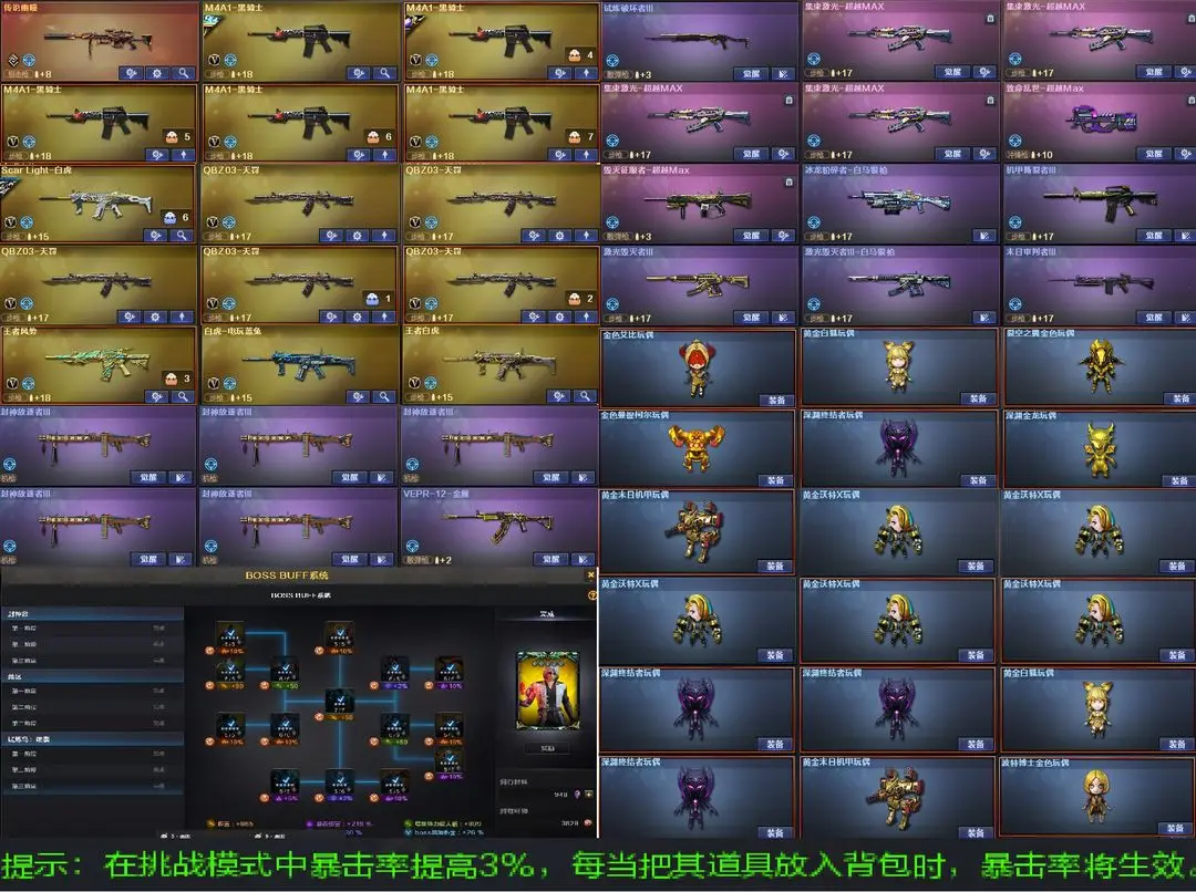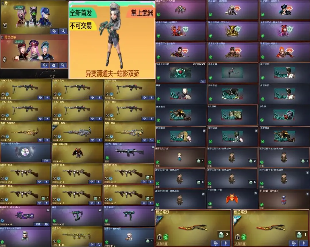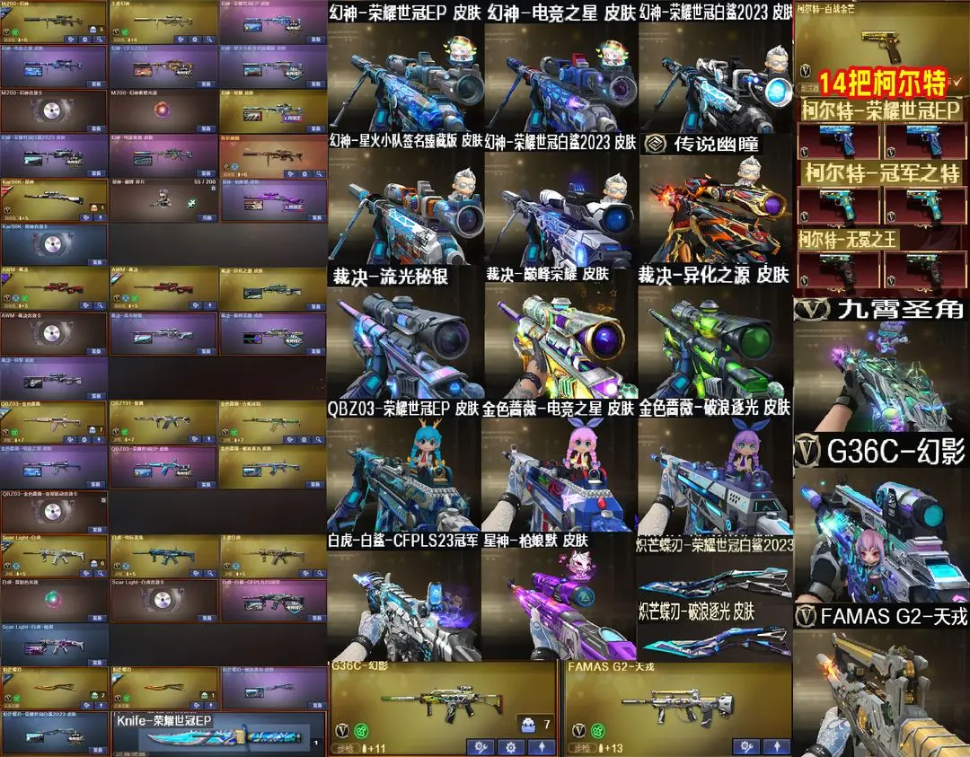 【装备道具】:全新荣耀EP套装妮妮,两套黄金套(次元+金狐),满Buff,6致命一击2,角斗场榜60,剩100多张五星卡,四星卡800左右,6黑搭配7无尽模式攻击力玩偶,轻松50关,爆破全装,各类热门武器均带质量皮,4防角色8个左右,生化小毕业,九霄圣角满级,带金色字体❤幻神-荣耀世冠EP/幻神-电竞之星/幻神-电流骇客/幻神-星火小队签名臻藏版/幻神-荣耀世冠白鲨2023/幻神-CFS2022/幻神-星耀/星神-枪娘默/毁灭-定军扬威/幻影-破浪逐光/金色蔷薇-电竞之星/金色蔷薇-破浪逐光/白虎-白鲨-CFPLS23冠军/Scar 白虎-暗星/QBZ03-荣耀世冠EP/世冠白鲨炽芒蝶刃-破浪逐光❤幻神音效卡/星神音效卡/白虎音效卡/裁决音效卡/极光音效卡/❤传说星骇/妮妮❤传说幽瞳/传说幽冥3把❤竞技荣光套装/王者玄武/王者霜心/VSK-94-金蚀/王者风神-觉醒版/炼狱-百战金芒/柯尔特-荣耀世冠EP(2)/柯尔特-百战金芒/USP-冥王/柯尔特-荣耀世冠白鲨2023/柯尔特-无冕之王(2)/屠龙-电竞之星❤G36C-幻影/QBZ-银翼游侠/FAMAS G2-天戎/全音效卡6烈6盘