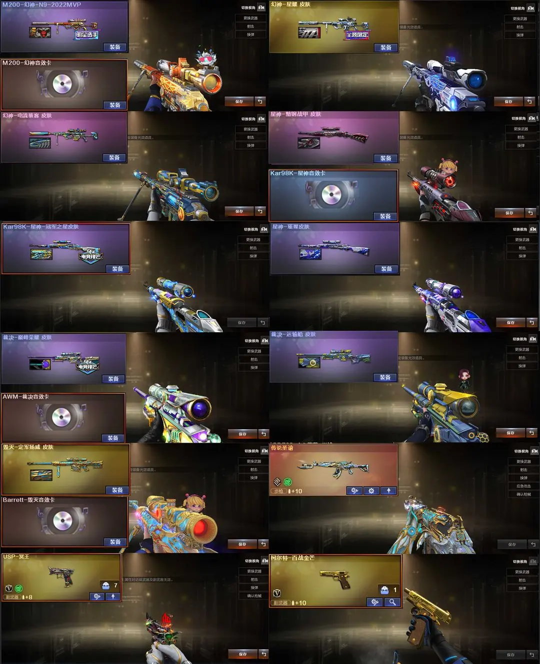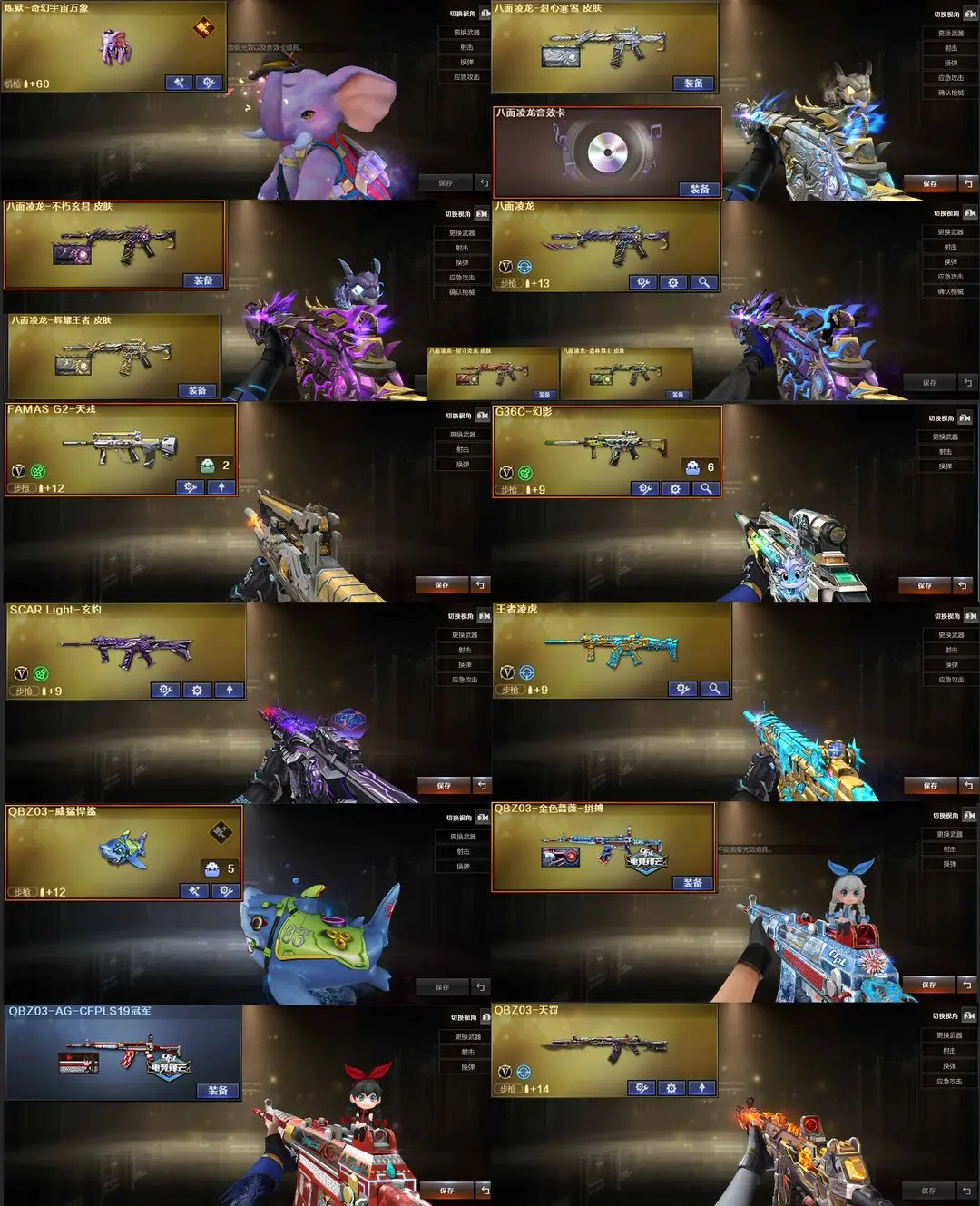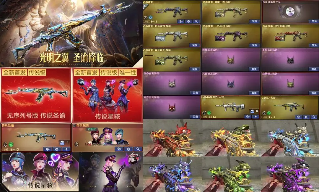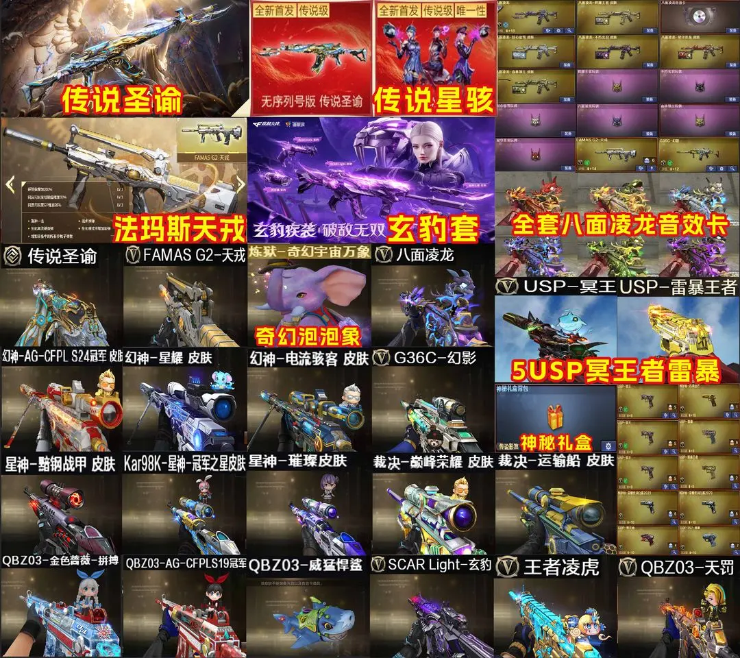 【装备道具】:传说星骇/传说圣谕★幻神-电流骇客 皮肤/幻神-AG-CFPL S24冠军 皮肤/幻神-星耀/星神-黯钢战甲/星神-冠军之星/星神-璀璨/毁灭-定军扬威/裁决-运输船/裁决-巅峰荣耀/火麒麟-巅峰荣耀/雷神-仲达白露/八面凌龙-封心寒雪/八面凌龙-辉耀王者/八面凌龙-星守炎龙/八面凌龙-森林领主/八面凌龙-不朽玄君/白虎-暗星/QBZ03-AG-CFPLS19冠军/QBZ03-金色蔷薇-拼搏★幻神音效卡/星神音效卡/八面凌龙音效卡/毁灭音效卡/裁决音效卡/极光音效卡/炼狱-百战金芒音效卡★QBZ03-天罚/USP-雷暴★SCAR Light-玄豹/FAMAS G2-天戎/八面凌龙/G36C-幻影/★炼狱-百战金芒/柯尔特-百战金芒/USP-冥王(3)/Anaconda-玄豹/柯尔特-荣耀世冠白鲨2023/COP-堕天神/雷霆之契/★王者凌虎/USP-雷暴王者/王者冰锋(4)/★玄豹套装★关小雨/隼/荆棘/战地猎狐/_玄豹/QBZ03-威猛悍鲨/炼狱-奇幻宇宙万象/异变清道夫-蛇影双骄/MAC-10-千针棘鲨/COP-白鲨/茸茸小松狮/屠龙-星耀/炼狱-悦蓝/6烈龙6盘龙