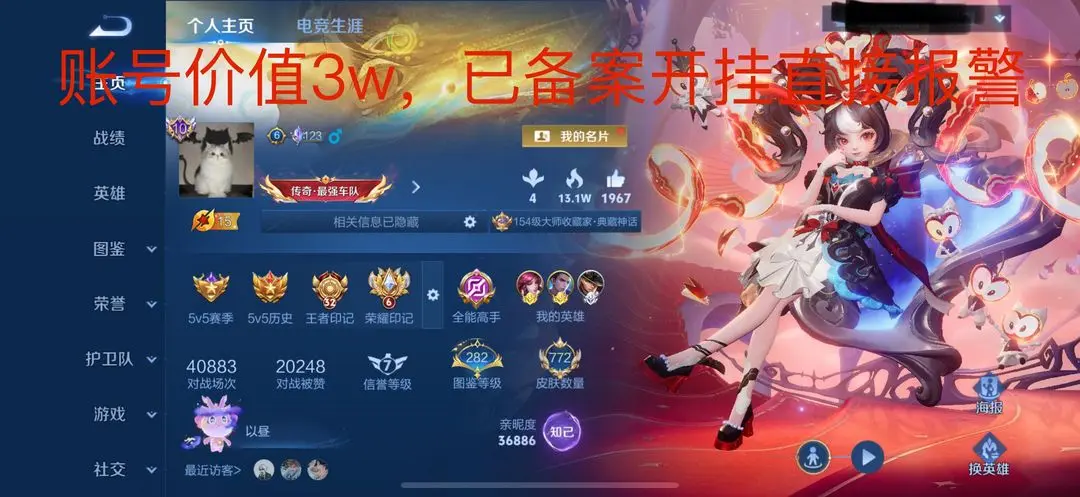 本游戏账号: V10荣耀贵族用户,基础段位:至尊星耀III,英雄多,皮肤多。典藏皮肤18个,感受典藏皮肤带来的优质体验快感,FMVP皮肤12个,尽情享受FMVP皮肤带来的主角光环, 私人所属英雄皮肤有:孙尚香 杀手不太冷||瑶 拾光映像||虞姬 神鉴启示录||孙悟空 全息碎影||小乔 天鹅之梦||伽罗 最初的交响||韩信 弑枪猎影||貂蝉 幻阙歌||诸葛亮 星域神启||李白 鸣剑·曳影||关羽 赤影疾锋||鲁班七号 星空梦想||武则天 倪克斯神谕||芈月 大秦宣太后||夏侯惇 无限飓风号||花木兰 九霄神辉||铠 银白咏叹调||程咬金 活力突击,等等