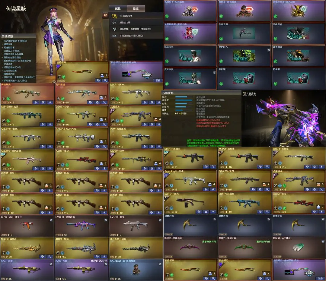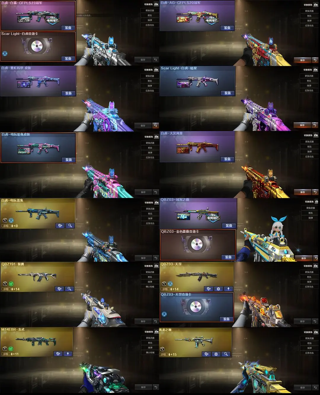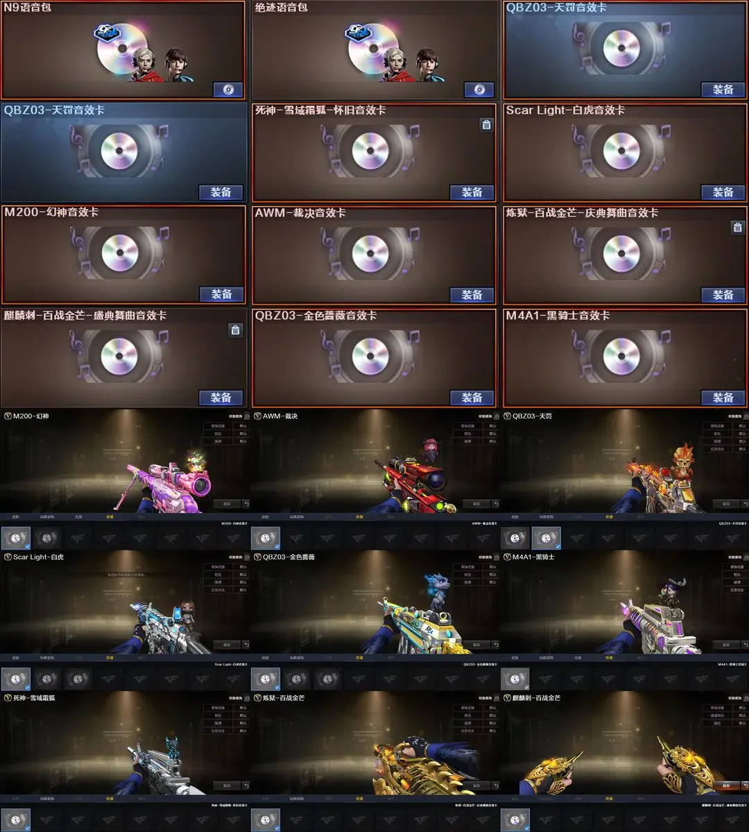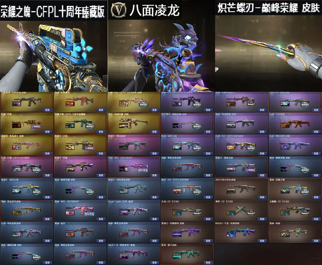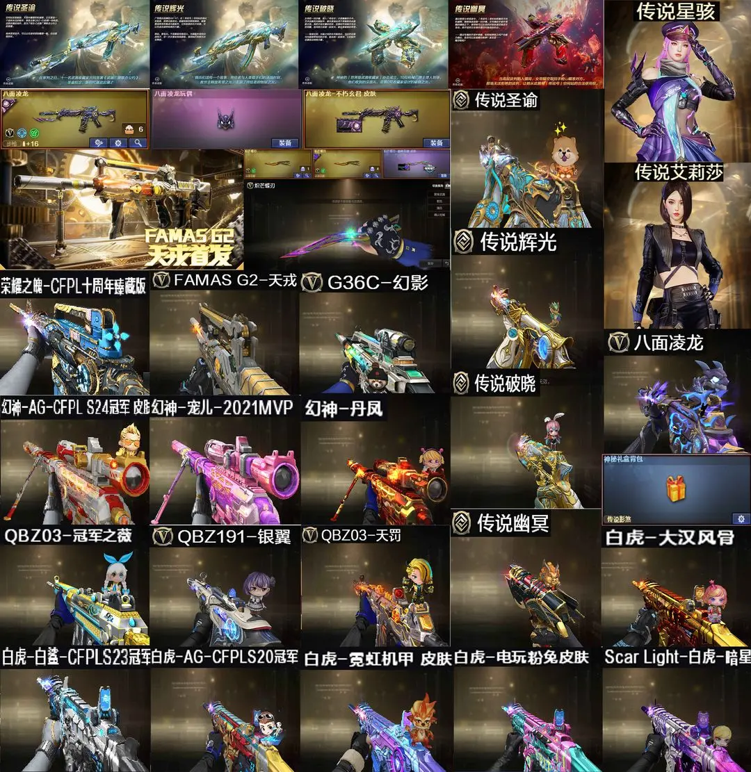 【装备道具】:巅峰蝶刃天戎幻影传说艾莉莎/传说星骇/传说圣谕/传说辉光/传说幽冥/传说破晓★神秘礼盒金色昵称★幻神-AG-CFPL S24冠军/幻神-宠儿-2021MVP/幻神-丹凤/雷神-R.LGD-CFPLS18冠军/雷神-荣耀世冠AG/雷神-宠儿/雷神-荣耀之魄/雷神-虎将/荣耀之魄-CFPL十周年臻藏版/八面凌龙-不朽玄君/白虎-白鲨-CFPLS23冠军/Scar Light-白虎-暗星/白虎-大汉风骨/白虎-电玩粉兔/白虎-霓虹机甲/白虎-AG-CFPLS20冠军/QBZ03-冠军之薇/超新星-兔兔战士/炽芒蝶刃-巅峰荣耀★FAMAS G2-天戎/G36C-幻影/QBZ191-银翼游侠/八面凌龙//VSK-94-金蚀/炼狱-百战金芒/COP 357-雪域霜狐/炽芒蝶刃2把/柯尔特-冠军之特/QBZ03-天罚/Scar-白虎/白虎-电玩蓝兔/M14EBR-玄武/★幻神音效卡/金色蔷薇音效卡/天罚音效卡/白虎音效卡/黑骑士音效卡/裁决音效卡/炼狱-百战金芒-庆典舞曲音效卡/★王者破空枪刃/王者冰锋★荒漠琉璃/月兔特工/雪域霜狐/★佣兵觉醒无需换弹手斧镜减速雷★捕食者之眼查看血量★