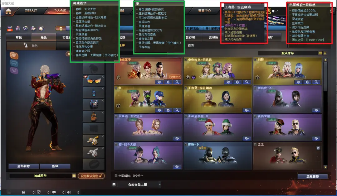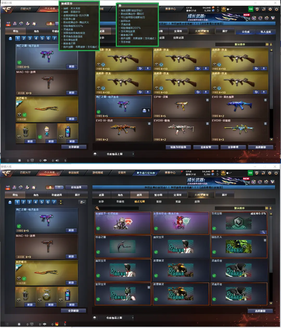 排位:可以、、、、、、、生化四防极品(可以变更背包、看僵尸血量):无需换弹、6烈龙、死亡之眼、MAC-涂鸦、炽芒蝶刃、手斧镜、生化减速雷、超级对讲机、全部弹匣、、、、、、爆破四防:幻神(23白鲨皮肤)、M200-竞技荣光、98K星神-量子之心、、、、、USP神工天巧、COP雷霆、2个柯尔特竞技荣光、冠军之特、23白鲨柯尔特、玄豹左轮、、、、神威天绫、G36幻影、加利尔ACE-天袭、FAMAS G2-天戎、白虎、玄豹白虎、QBZ金色蔷薇、、、白虎音效、、、2套竞技荣光、2套神工天巧、2套玄豹、2套雷暴王者、、、生化四防(隼、神威莲华)、爆破四防(王者惊若翩鸿、云悠悠、荆棘)