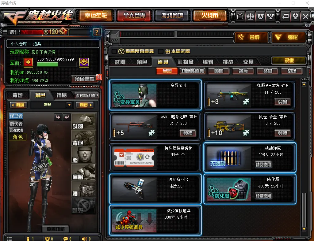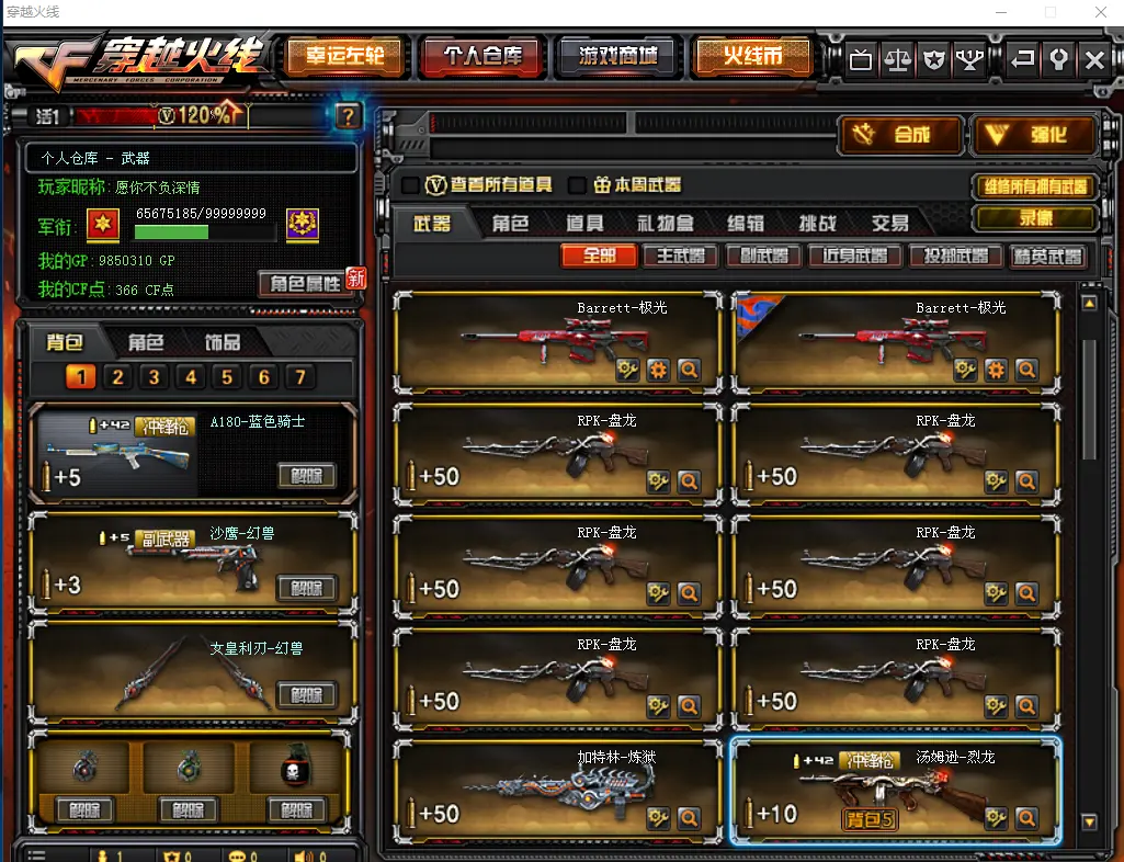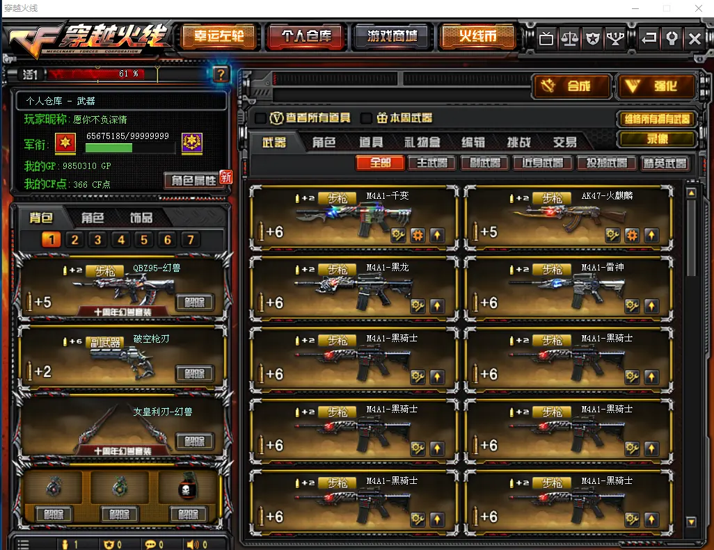 本游戏账号:英雄武器79个; 王者武器2个。 可以玩爆破号、生化号、双全装、稀有武器、等模式。装备不多,但是主武器、副武器、近身武器够用 拥有完美游戏体验。重要的是,特殊装备有:M4A1-玫瑰精灵、黑骑士-海王、麒麟刺、AK47-火麒麟、加特林-炼狱、蝴蝶、堕天使、生化弹匣、等,随意畅选。