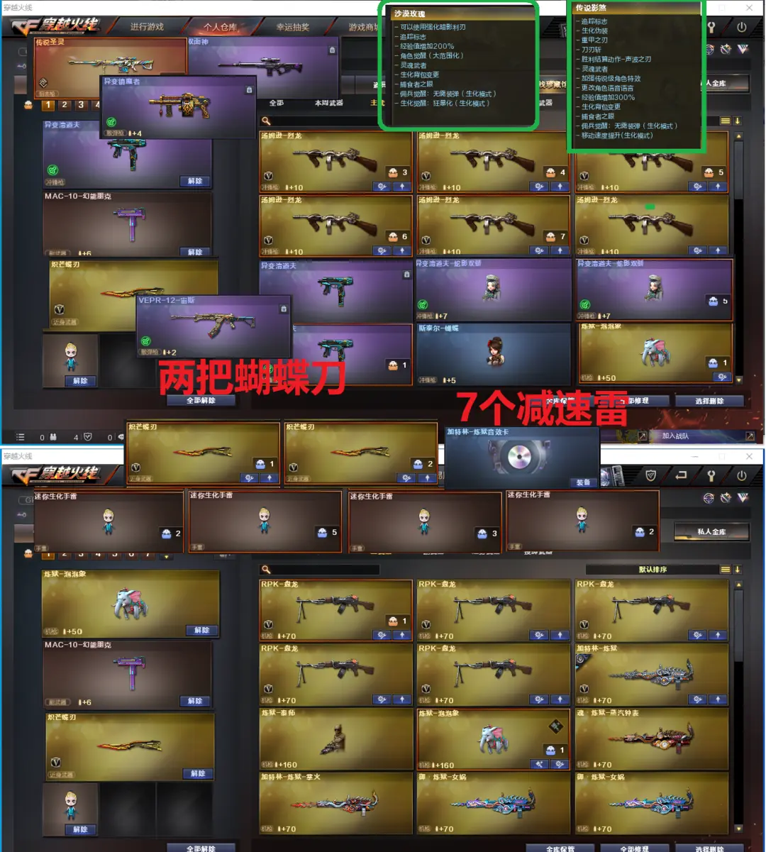 【两把清道夫小人枪、卡无限子弹】排位;可以----------------生化四防极品号(可以变更生化背包、可以查看生化僵尸血量):无需换弹、6烈6盘龙、炼狱泡泡象、传说圣灵、双面神、斯泰尔蝴蝶、宙斯、炼狱秦师、异变镇魔者、2个异变清道夫、死亡之眼、MAC涂鸦、手斧镜 、2把蝴蝶刀、7个生化减速雷、超级对讲机、全部弹匣、、。爆破全装:幻神降龙、M200-竞技荣光、王者星神、玄豹白虎、传说圣灵、、COP幻灵、2套玄豹、竞技荣光柯尔特、炼狱音效、、QBZ云龙、、2套夜魔、7套电竞装甲、7套竞技荣光、、、、爆破四防(云悠悠、玄豹、鹰、雨棠、华)、生化四防(传说影煞、沙漠玫瑰)