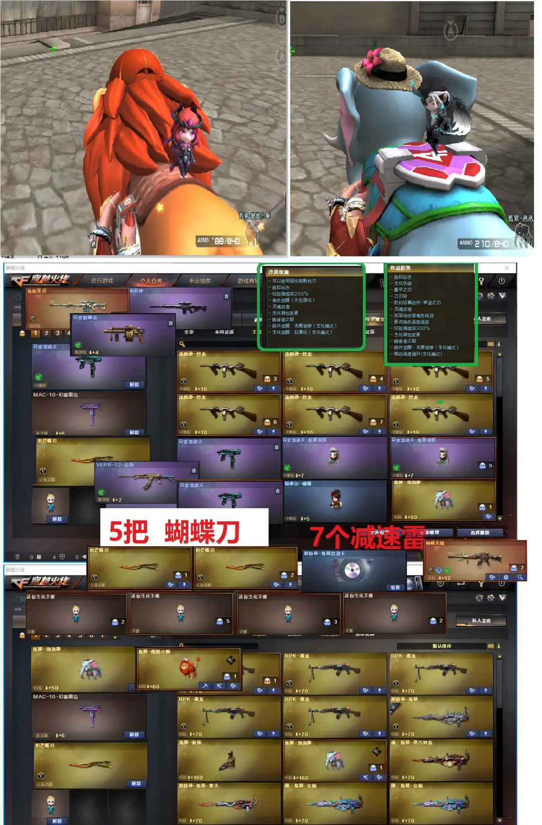 【神威莲华、5把蝴蝶刀、满级八面凌龙、两把清道夫小人枪、卡无限子弹、生化挑战爆破极品】排位;可以----------------生化四防极品号(可以变更生化背包、可以查看生化僵尸血量):无需换弹、6烈6盘龙、炼狱-酷酷小狮、炼狱泡泡象、满级八面凌龙、传说圣灵、双面神、斯泰尔蝴蝶、宙斯、炼狱秦师、异变镇魔者、2个异变清道夫、死亡之眼、MAC涂鸦、手斧镜 、5把蝴蝶刀、7个生化减速雷、超级对讲机、全部弹匣、、。爆破全装:幻神降龙、M200-竞技荣光、王者星神、、、神威天绫、玄豹白虎、传说圣灵、、COP幻灵、2套玄豹、竞技荣光柯尔特、炼狱音效、、QBZ云龙、、2套夜魔、7套电竞装甲、7套竞技荣光、、、、爆破四防(云悠悠、玄豹、鹰、雨棠、华)、生化四防(神威莲华、传说影煞、沙漠玫瑰、虹儿)
