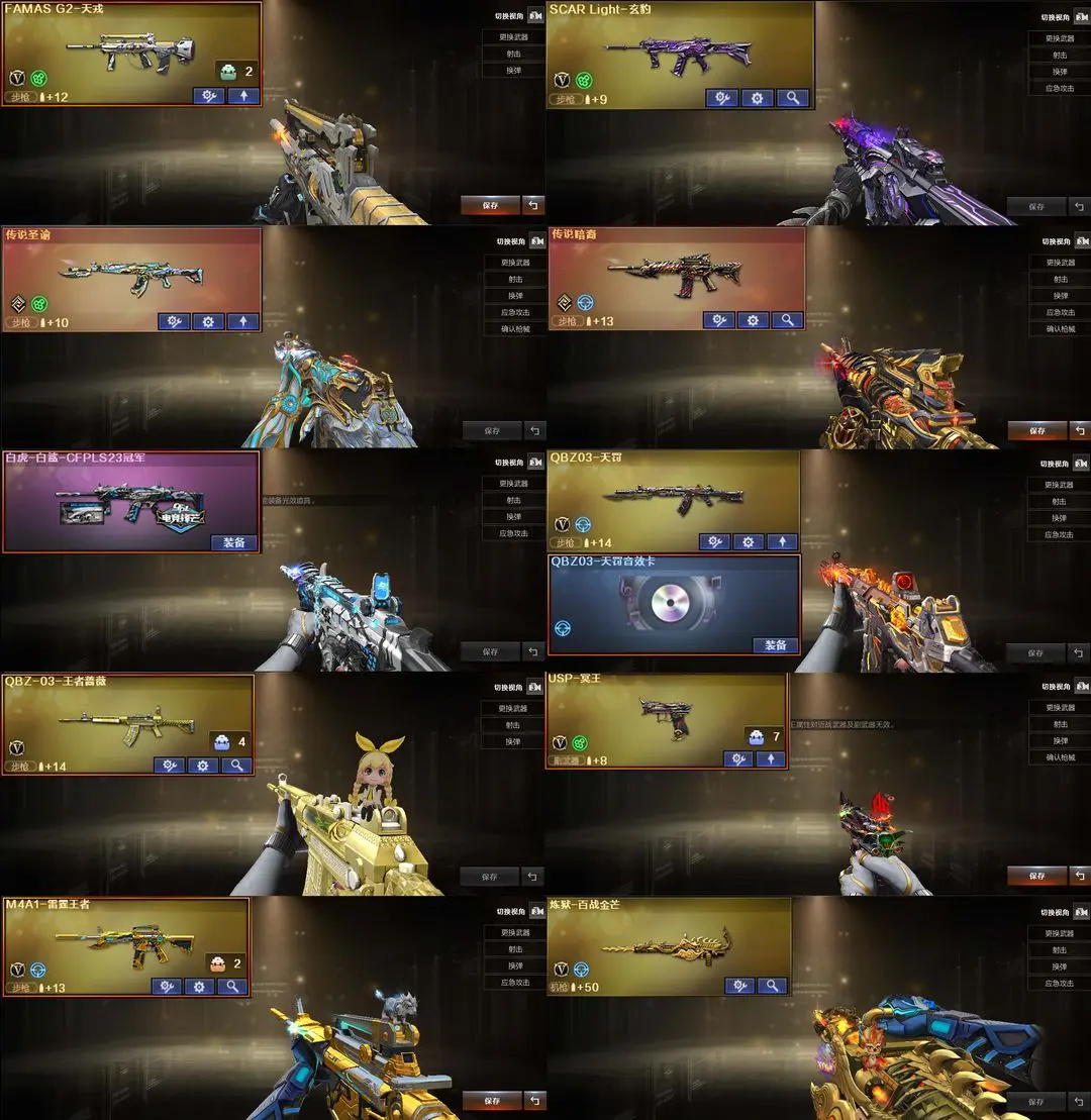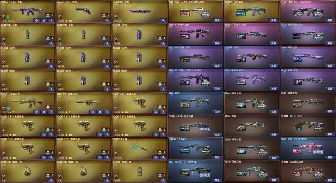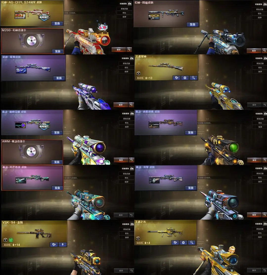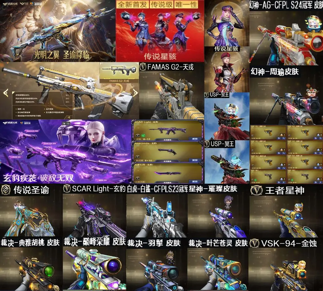 【装备道具】:传说星骇/传说圣谕/传说暗裔❤FAMAS G2-天戎/SCAR Light-玄豹VSK-94-金蚀/炼狱-百战金芒/USP-冥王(2)❤幻神-AG-CFPL S24冠军 皮肤/幻神-周瑜皮肤/星神-璀璨❤裁决-叶芒苍灵 皮肤/裁决-典雅胡桃 皮肤/裁决-巅峰荣耀 皮肤/裁决-羽掣 皮肤/雷神-R.LGD-CFPLS18冠军/雷神-冠军之魄/雷神-宠儿-2019MVP/雷神-杨戬/雷神-虎将/白虎-白鲨-CFPLS23冠军/幻神音效卡/天罚音效卡/黑骑士音效卡/毁灭音效卡/裁决音效卡/炼狱-百战金芒-庆典舞曲音效卡❤Anaconda-玄豹/荣耀世冠-柯尔特/QBZ-03-王者蔷薇/QBZ03-金色蔷薇/QBZ03-天罚王者星神-觉醒版/Kar98K-星神/❤雷霆王者套装/玄豹套装❤荒漠琉璃/隐/王者冰锋/高爆手雷-雷霆王者/COP 357-雷霆王者-觉醒版/雷霆王者之锋-觉醒版/幻灵之锋/荣耀世冠-雷神/王者蔷薇-觉醒版//王者之光-觉醒版/Barrett-雷霆王者-觉醒版/Barrett-朱雀/灵狐者-职业经理/