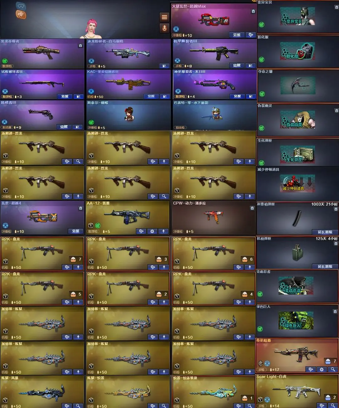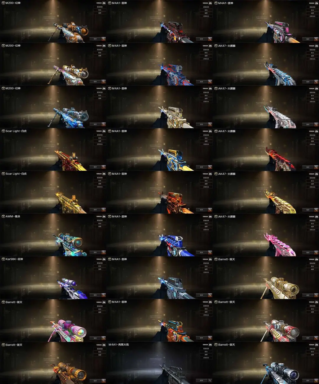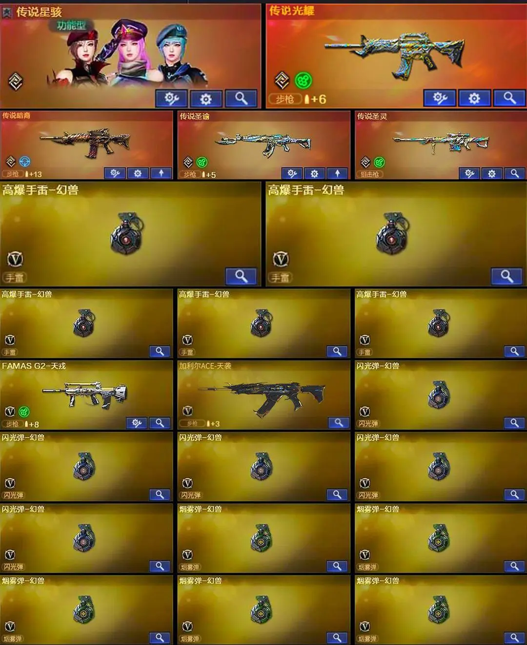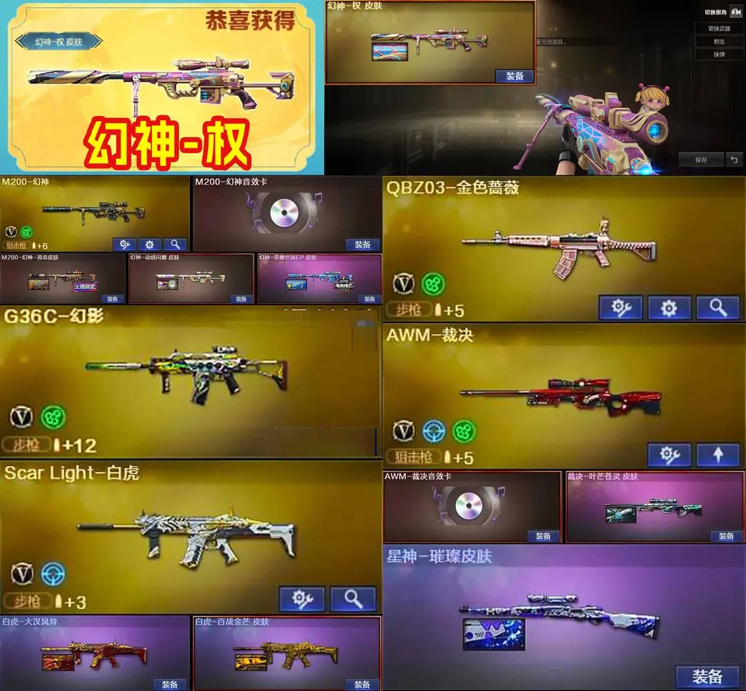 【装备道具】:幻神权,晴雅,传说星骇,传说光耀,传说暗裔,传说圣谕,传说圣灵★G36C-幻影,QBZ03-金色蔷薇,Scar Light-白虎,M200-幻神,死亡之眼,QBZ03-街机,M4A1-黑骑士*7,汤姆逊-烈龙*6,RPK-盘龙*6,加特林-炼狱*6,斯泰尔-蝴蝶,雷神-小红,USP-雷暴*2,COP-堕天神*3,COP 357-幻灵*2,沙鹰-修罗*7,高爆手雷-幻兽*5★幻神-黄忠,幻神-动感闪耀,幻神-荣耀世冠EP,白虎-大汉风骨,白虎-百战金芒,裁决-叶芒苍灵,裁决-胜者为王,星神-璀璨,雷神-冠军之魄,毁灭-SV-CFPLS16冠军,火麒麟-轻羽,火麒麟-盘古,毁灭耀金★幻神音效卡/火麒麟音效卡/雷神音效卡/黑龙音效卡/黑骑士音效卡/毁灭音效卡/裁决音效卡/天罚音效卡/炼狱-百战金芒★蝴蝶,春,沙漠玫瑰,影豹,审判者,妮妮,王者涂鸦,王者-魅影,幽,职业选手,海豹突击队,金蚀-机械姬,斯泰尔-蝴蝶★火狱乱世-超越Max★USP-雷暴*2,COP-堕天神*3,COP 357-雷霆王者-觉醒版,COP 357-幻灵*2,柯尔特-电竞装甲,柯尔特-荣耀世冠EP,破空枪刃