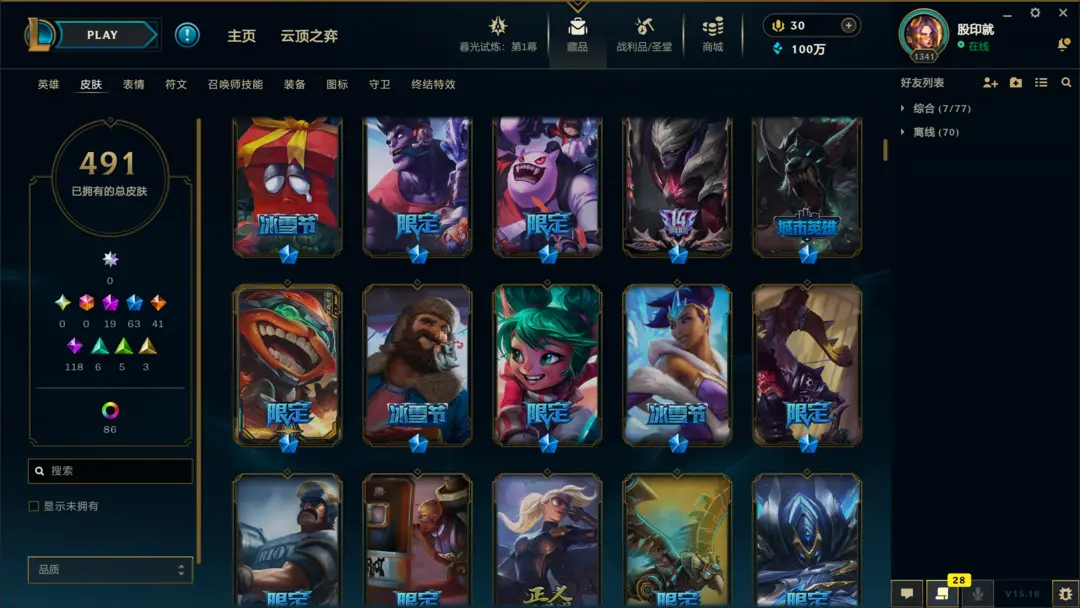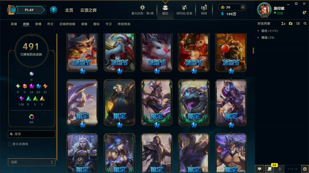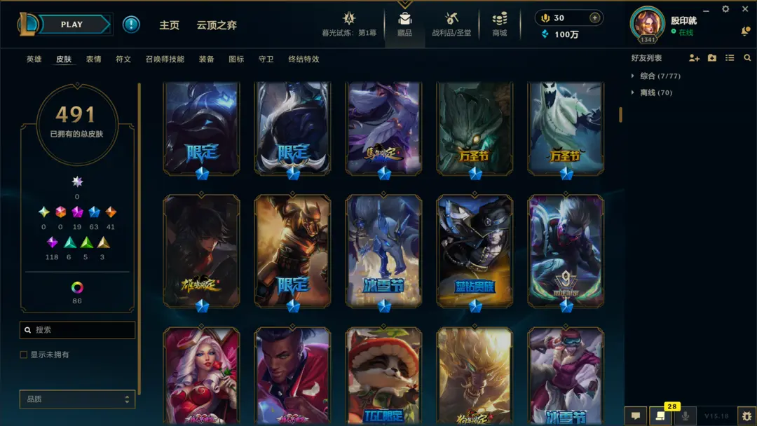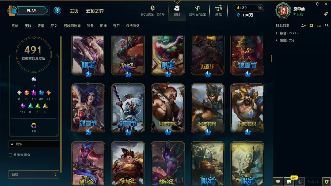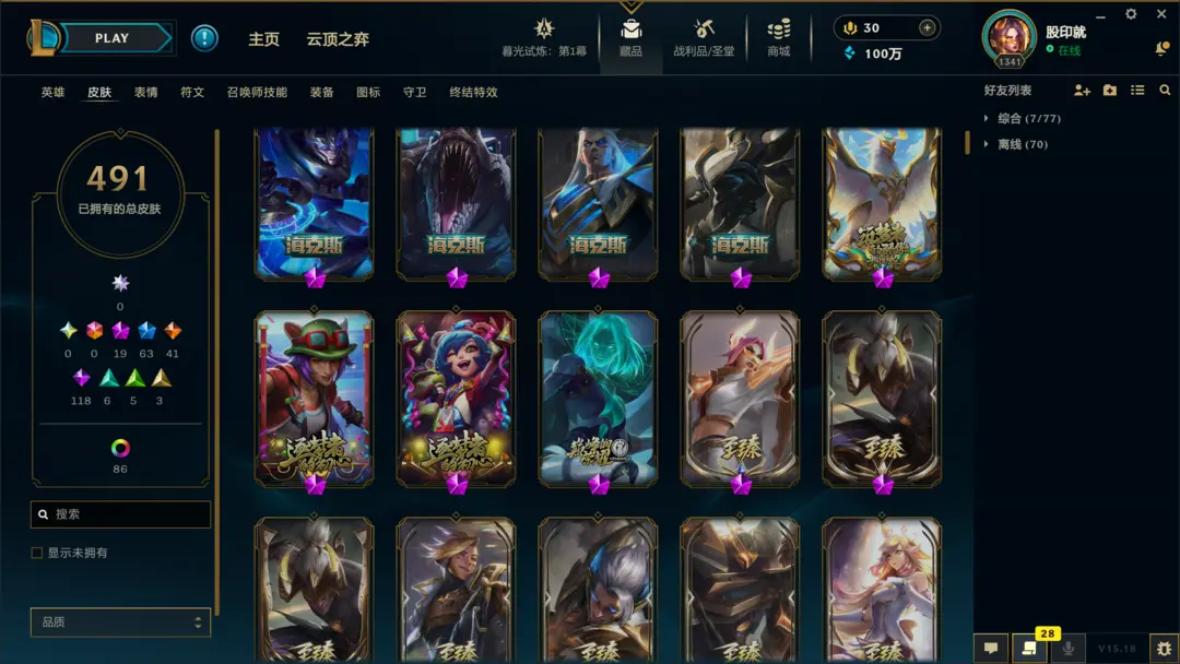 段位准█1000皮肤〓20至臻海克斯〓神王嫦娥〓黑夜亚索〓猩红源计划系列