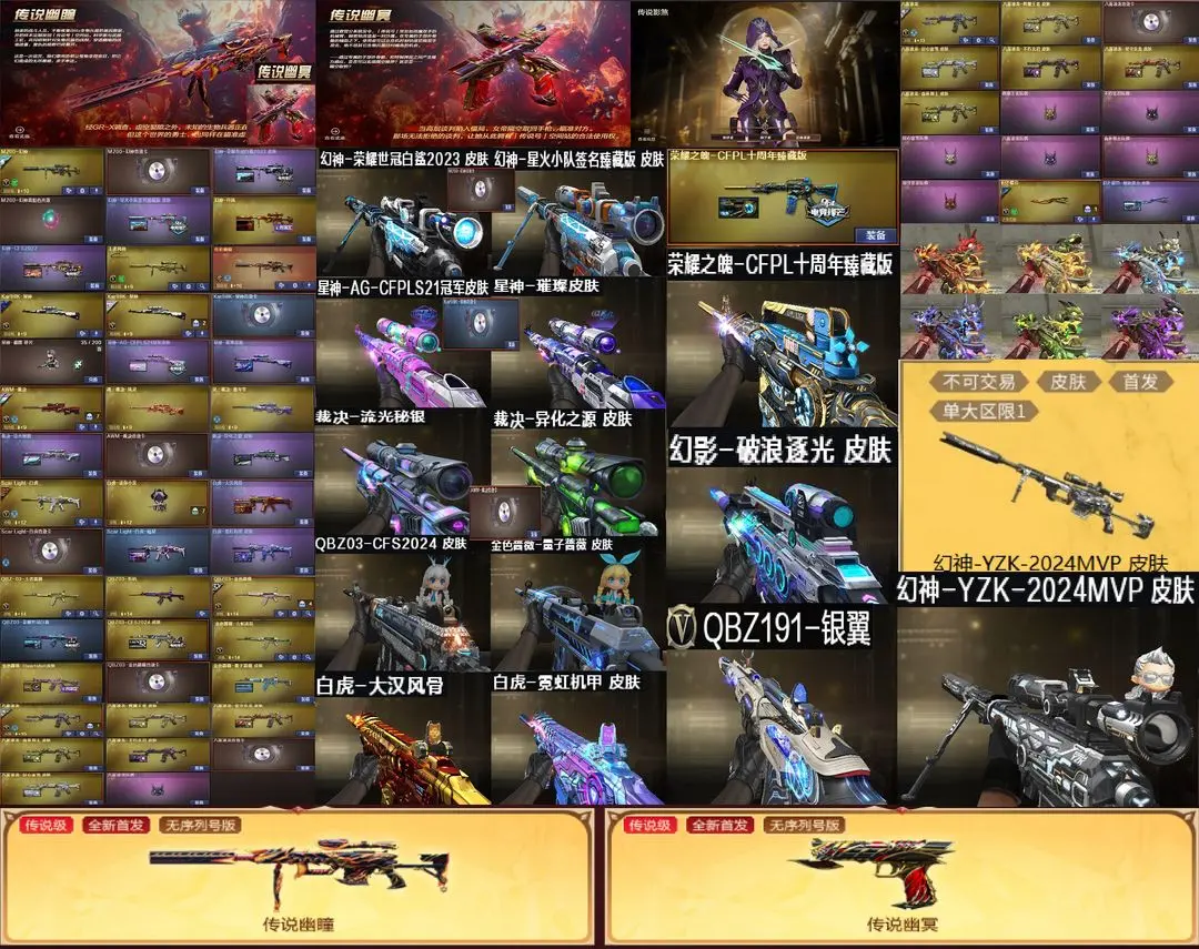 【装备道具】:传说幽瞳★传说幽冥(2)★传说影煞★M200-幻神★M200-竞技荣光★98K-星神★G36C-幻影★王者芳薇★王者风神-觉醒版★柯尔特-荣耀世冠白鲨2023(2)★柯尔特-无冕之王★QBZ-银翼游侠★八面凌龙★幻神-星火小队签名臻藏版★幻神-荣耀世冠白鲨2023★幻神-丹凤★幻神-CFS2022★星神-AG-CFPLS21冠军皮肤★星神-璀璨★毁灭-Heartshot★裁决-流光秘银★裁决-异化之源★雷神-源计划2.0专属★雷神-白鲨★雷神-虎将★雷神-HeartShot黑骑士-冠军之势★荣耀之魄-CFPL十周年臻藏版★幻影-破浪逐光★八面凌龙-封心寒雪/八面凌龙-辉耀王者/八面凌龙-星守炎龙★八面凌龙-森林领主/八面凌龙-不朽玄君★金色蔷薇-量子蔷薇★金色蔷薇-Heartshot/-白虎-暗星★白虎-大汉风骨★白虎-霓虹机甲★QBZ-CFS2024★白鲨QBZ★柯尔特-竞技荣光★荣耀世冠-柯尔特★COP-云龙★COP-幻灵★COP -雷霆王者-觉醒版★王者凤吟Scar-马枪★★影豹/月兔特工/晴雅/岚兮儿/雨墨/星际战将/王者春/王者炫/王者凌霄