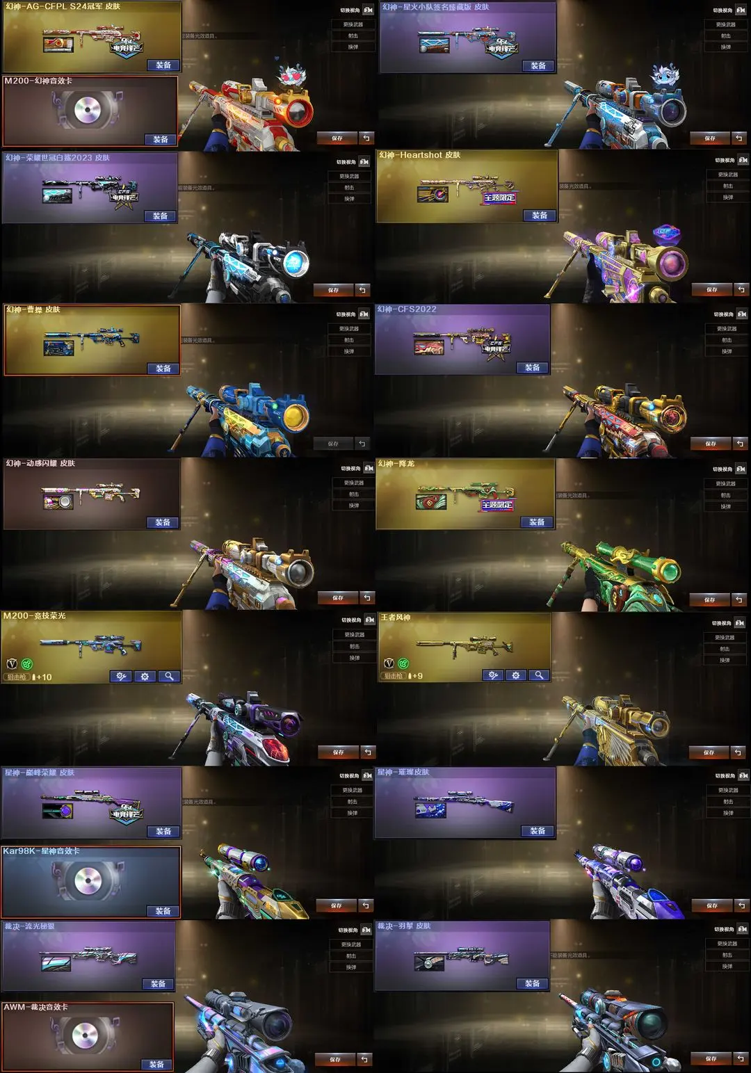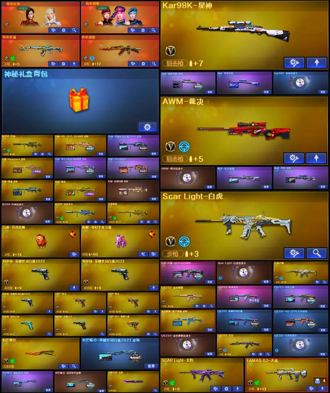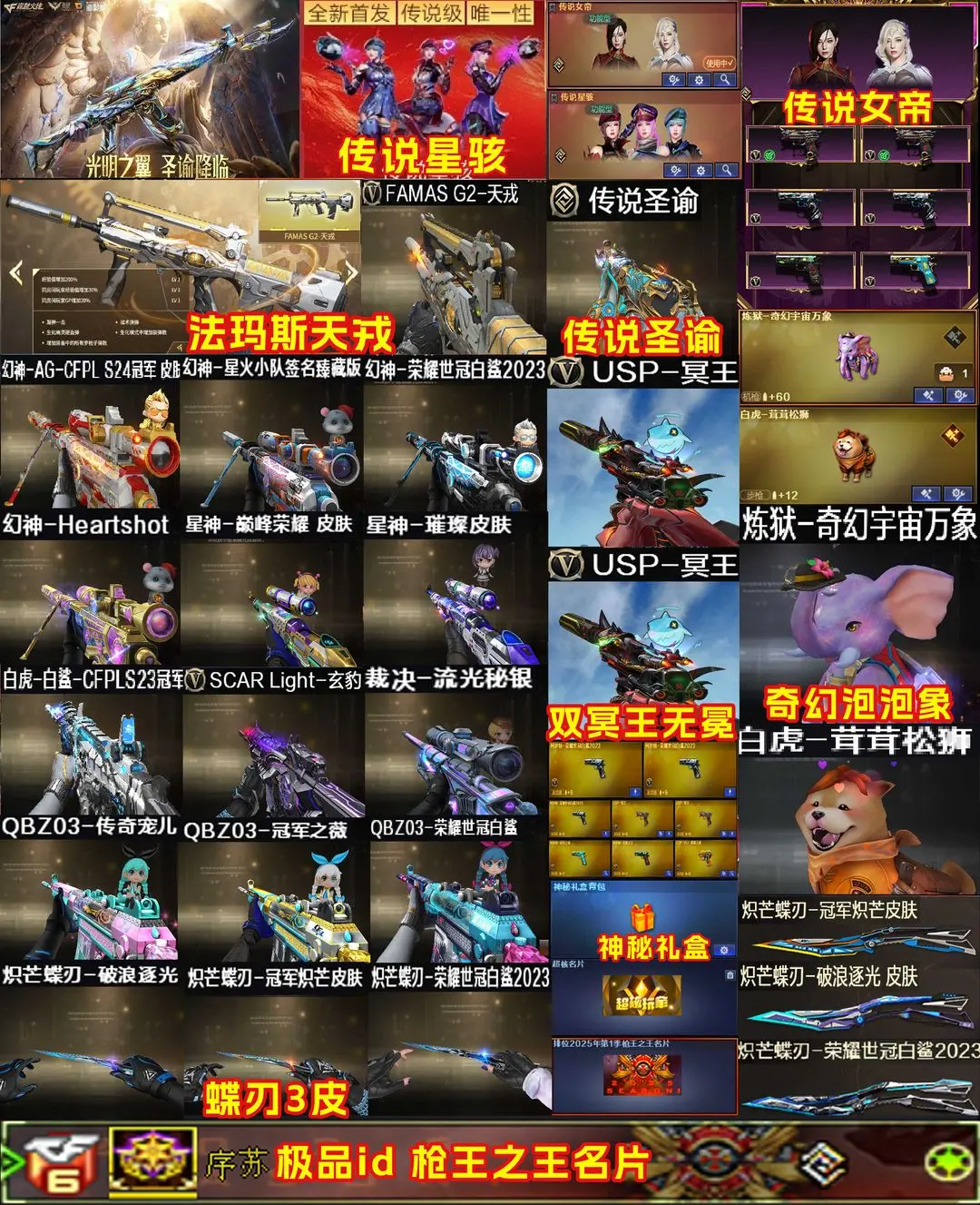 【装备道具】:幻神三件套⭐幻神7皮⭐星神三件套⭐裁决三件套⭐白虎三件套⭐金色蔷薇三件套⭐毒蜂⭐炼狱-迷你小钢⭐竞技荣光套装X1套⭐传说女帝⭐传说星骇⭐传说圣谕⭐传说夜影⭐神秘礼盒背包⭐超核玩家名片⭐枪王之王名片⭐幻神-AG-CFPL S24冠军⭐幻神-荣耀世冠白鲨2023⭐幻神-Heartshot⭐幻神-星火小队签名臻藏版⭐幻神-CFS2022⭐幻神-曹操 皮肤⭐幻神-降龙⭐幻神-动感闪耀⭐幻神音效卡⭐M200-竞技荣光⭐王者风神-觉醒版⭐星神-巅峰荣耀⭐星神-璀璨⭐星神音效卡⭐AWM-裁决⭐AWM-裁决音效卡⭐裁决-流光秘银⭐裁决-羽掣⭐白虎-白鲨-CFPLS23冠军⭐白虎音效卡⭐白虎之魄-觉醒版⭐QBZ-传奇宠儿⭐QBZ-冠军之薇⭐蔷薇-量子蔷薇⭐QBZ荣耀世冠白鲨⭐QBZAG-S19冠军⭐QBZ-天罚⭐scar-玄豹⭐FAMAS G2-天戎⭐柯尔特-荣耀世冠白鲨⭐USP-冥王⭐柯尔特-无冕之王⭐柯尔特-冠军之特⭐世冠白鲨炽芒蝶刃破浪逐光⭐冠军炽芒蝶刃⭐泡泡象炼狱-奇幻宇宙万象⭐白虎-茸茸松狮⭐电竞教官-云悠悠⭐机械姬⭐晴雅⭐6盘龙炼狱小钢⭐王者沙漠玫瑰⭐佣兵觉醒捕食者之眼