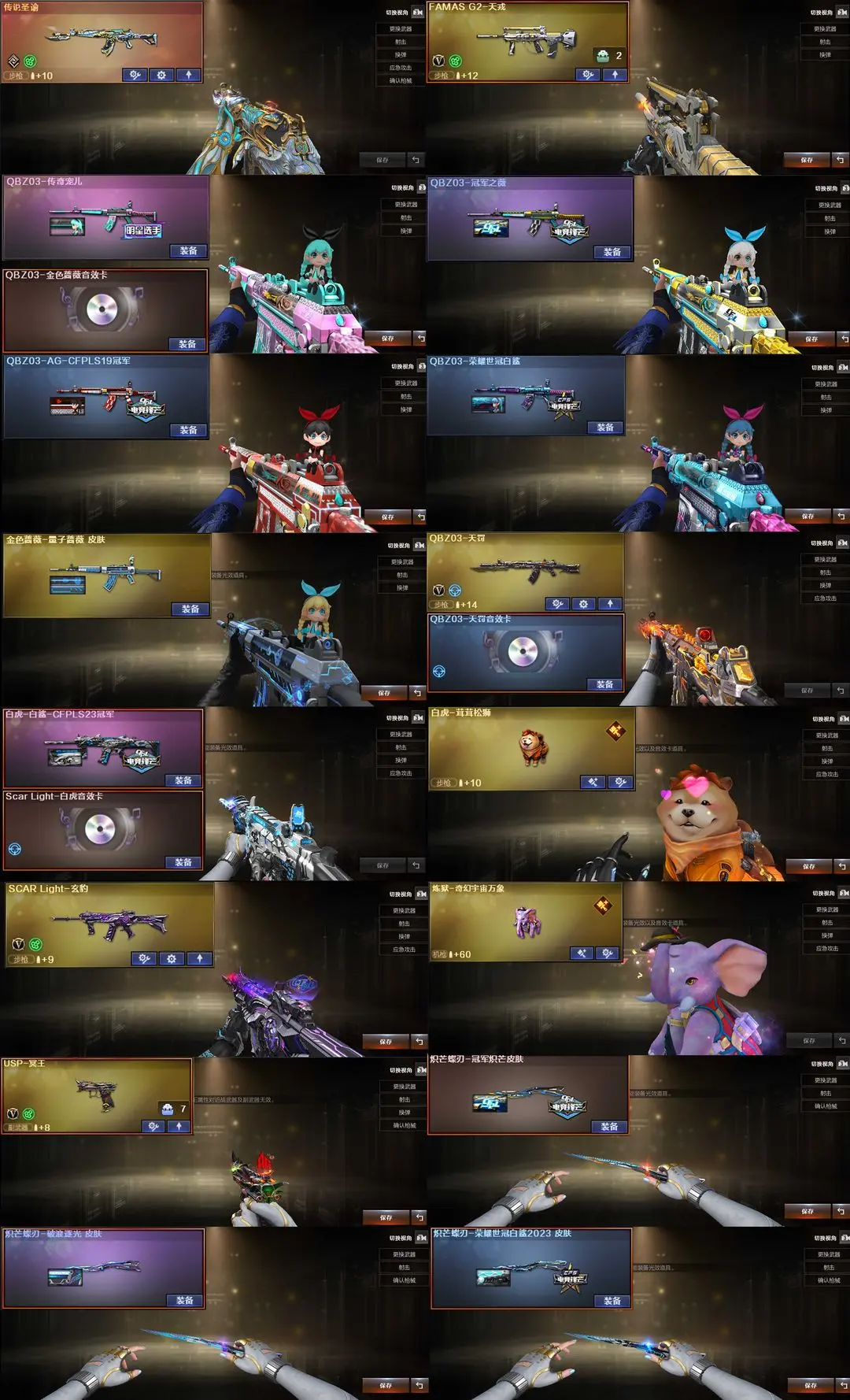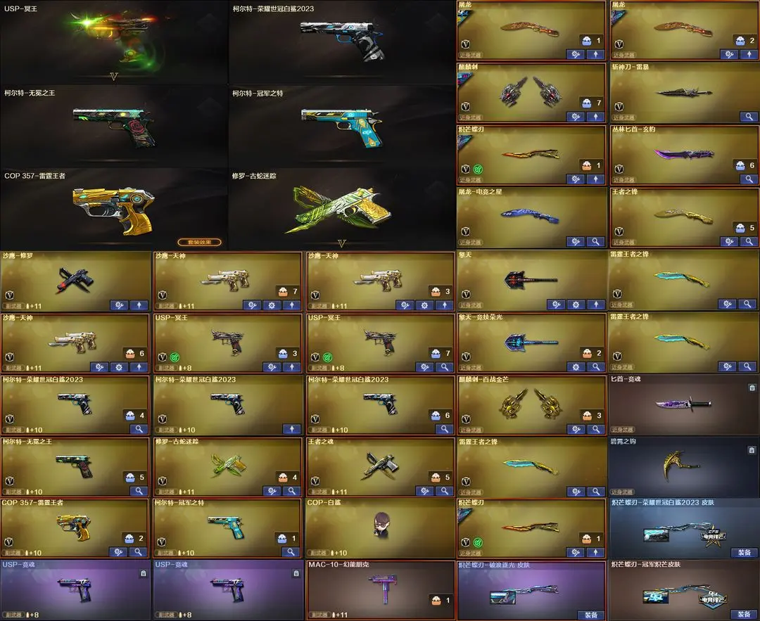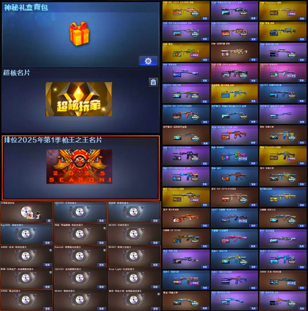 【装备道具】:幻神三件套⭐幻神7皮⭐星神三件套⭐裁决三件套⭐白虎三件套⭐金色蔷薇三件套⭐毒蜂⭐炼狱-迷你小钢⭐竞技荣光套装X1套⭐传说女帝⭐传说星骇⭐传说圣谕⭐传说夜影⭐神秘礼盒背包⭐超核玩家名片⭐枪王之王名片⭐幻神-AG-CFPL S24冠军⭐幻神-荣耀世冠白鲨2023⭐幻神-Heartshot⭐幻神-星火小队签名臻藏版⭐幻神-CFS2022⭐幻神-曹操 皮肤⭐幻神-降龙⭐幻神-动感闪耀⭐幻神音效卡⭐M200-竞技荣光⭐王者风神-觉醒版⭐星神-巅峰荣耀⭐星神-璀璨⭐星神音效卡⭐AWM-裁决⭐AWM-裁决音效卡⭐裁决-流光秘银⭐裁决-羽掣⭐白虎-白鲨-CFPLS23冠军⭐白虎音效卡⭐白虎之魄-觉醒版⭐QBZ-传奇宠儿⭐QBZ-冠军之薇⭐蔷薇-量子蔷薇⭐QBZ荣耀世冠白鲨⭐QBZAG-S19冠军⭐QBZ-天罚⭐scar-玄豹⭐FAMAS G2-天戎⭐柯尔特-荣耀世冠白鲨⭐USP-冥王⭐柯尔特-无冕之王⭐柯尔特-冠军之特⭐世冠白鲨炽芒蝶刃破浪逐光⭐冠军炽芒蝶刃⭐泡泡象炼狱-奇幻宇宙万象⭐白虎-茸茸松狮⭐电竞教官-云悠悠⭐机械姬⭐晴雅⭐6盘龙炼狱小钢⭐王者沙漠玫瑰⭐佣兵觉醒捕食者之眼