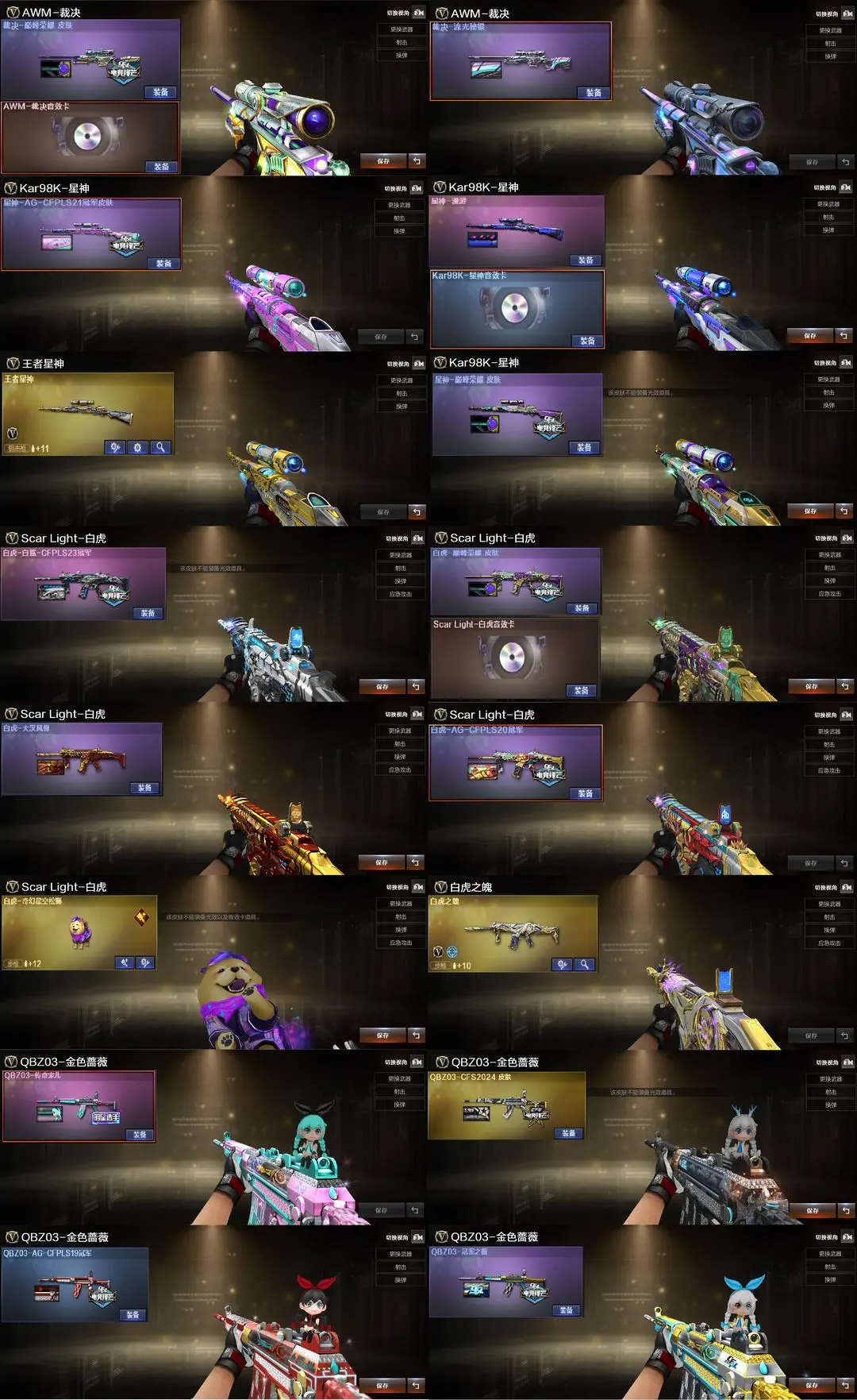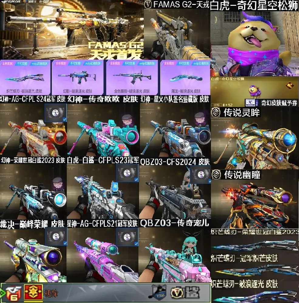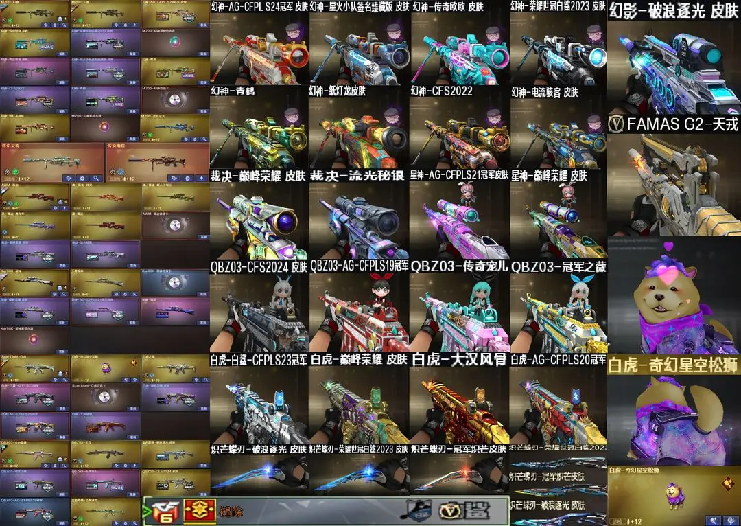【装备道具】:传说艾莉莎/传说夜影/传说幽瞳/传说灵眸★幻神-电流骇客 皮肤/幻神-纸灯龙/幻神-星火小队签名臻藏版/幻神-AG-CFPL S24冠军/幻神-欧欧/幻神-荣耀世冠白鲨2023 皮肤/幻神-青鹤/幻神-降龙/幻神-CFS2022/星神-巅峰荣耀/Kar98K-星神-AG-CFPLS21冠军/星神-漫游/裁决-流光秘银/裁决-巅峰荣耀/金色蔷薇-破浪逐光/白虎-白鲨-CFPLS23冠军/白虎-大汉风骨/白虎-巅峰荣耀/白虎-AG-CFPLS20冠军/QBZ03-CFS2024/QBZ03-AG-CFPLS19冠军/QBZ03-冠军之薇/QBZ03-传奇宠儿/屠龙-破浪逐光/炽芒蝶刃-破浪逐光/炽芒蝶刃-荣耀世冠白鲨2023/炽芒蝶刃-冠军炽芒/FAMAS G2-天戎/G36C-幻影/荣耀世冠-柯尔特/柯尔特-冠军之特/柯尔特-竞技荣光(2)/USP-雷暴/USP-神工天巧/白虎之魄/★白虎-奇幻星空松狮/炼狱-迷你小钢/斯泰尔-蝴蝶/COP-白鲨/幻灵套装/竞技荣光套装★影豹/电竞教官-云悠悠/关小雨/_晴雅/机械姬/星际战将/司雨/王者樱-热浪之夏/双面神/王者玉锋/