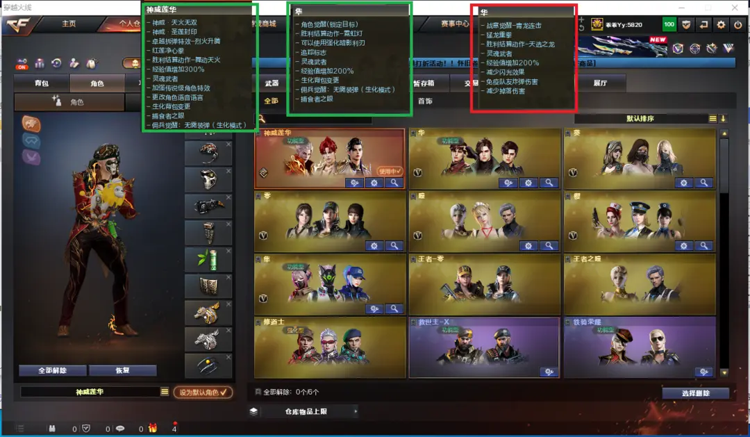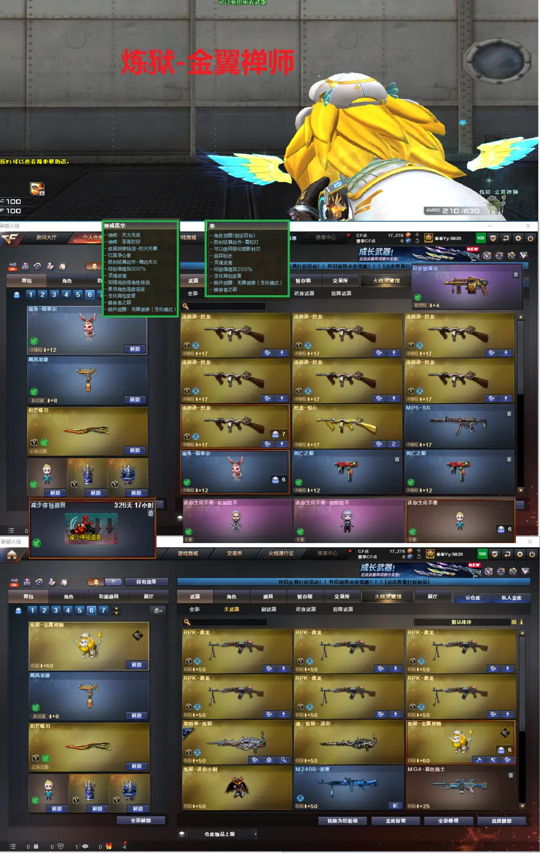 排位:可以、、、、、、、生化四防全装(可以变更背包、查看生化僵尸血量):无需换弹、炼狱-金翼禅师、炼狱小刚、6烈龙、6盘龙、炼狱、斯太尔-萌兔、异变镇魔者、死亡之眼、飓风双雄、MAC-涂鸦、炽芒蝶刃、手3生化减速手雷、超级对讲机、全部弹匣、、、、、、、、爆破全装:幻神(周瑜皮肤)G36幻影、神威天绫、QBZ云龙、COP云龙、、、7套云龙、、、生化人物(神威莲华、隼)爆破人物(华)