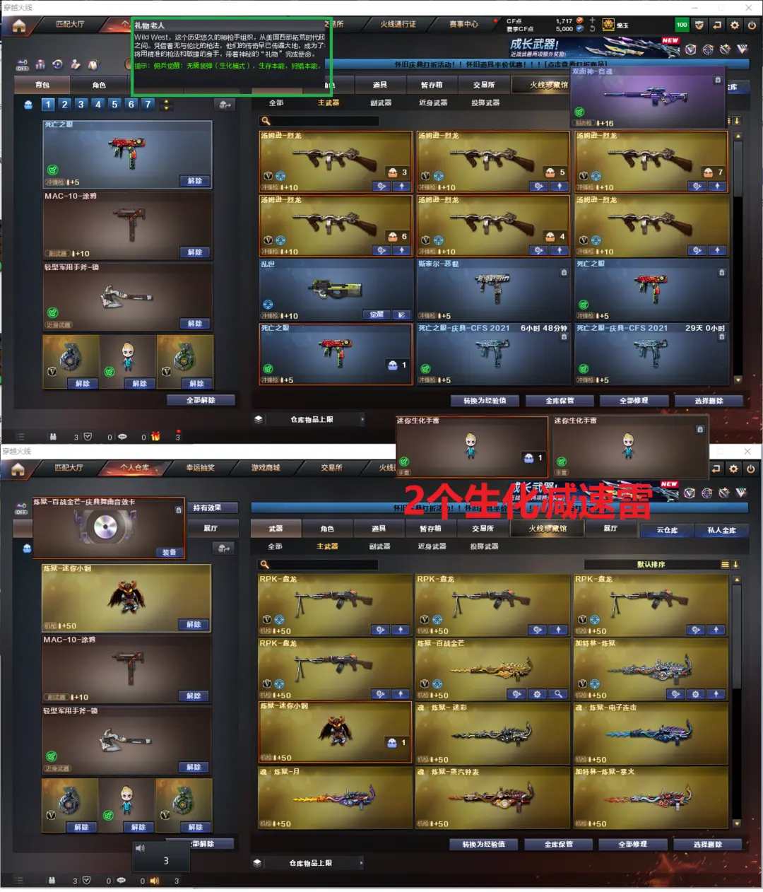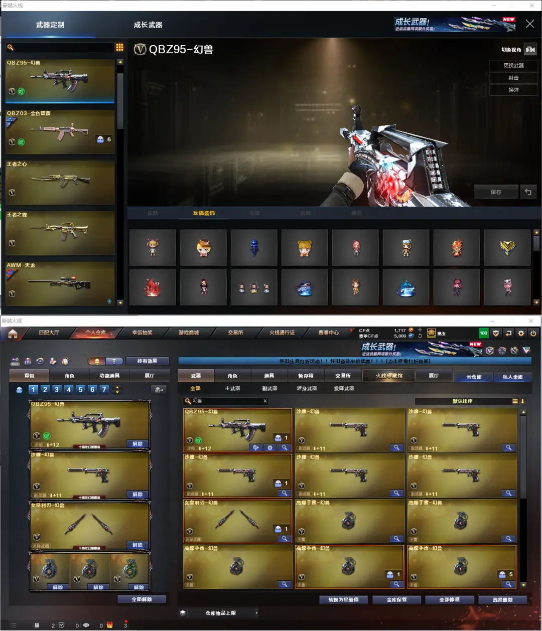 排位:可以、、、、、、、、生化全装(查看生化僵尸血量):无需换弹、6烈龙、4盘龙、2炼狱+音效、双面神、死亡之眼、MAC涂鸦、手斧镜 、2个生化减速雷、超级对讲机、全部弹匣、、、、、爆破四防:王者幻神、M200-竞技荣光、、、、USP神工天巧、COP堕天神、柯尔特竞技荣光、COP王者堕天神、破空枪刃、COP极地霜雄、5个幻兽沙鹰、QBZ幻兽、白虎、QBZ金色蔷薇、、、裁决音效、毁灭音效、炼狱音效、、、5套幻兽、1套雷霆、1套竞技荣光、7套夜魔、、、生化人物(礼物老人)、爆破四防(云悠悠、凌霄、鹰、王者潘多拉、王者国色天香)