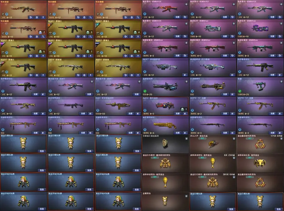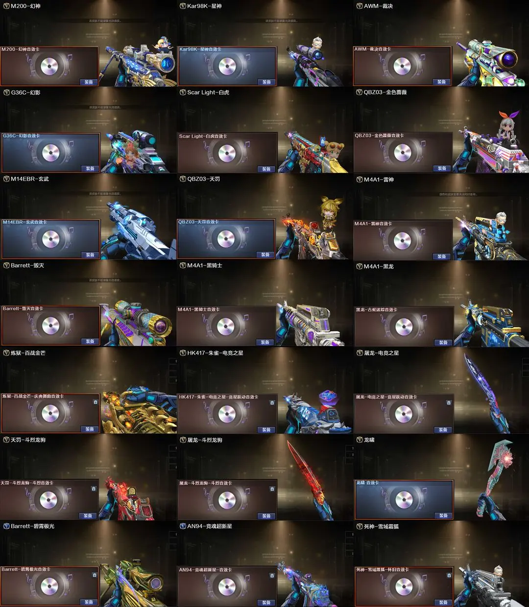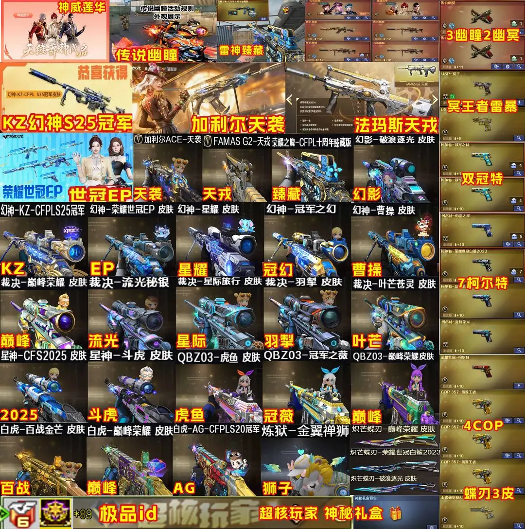 【装备道具】:炼狱金翼禅狮/神威莲华/传说星骇/传说夜影/3传说幽瞳/2传说幽冥★幻神-荣耀世冠EP/幻神-电流骇客/幻神-KZ-CFPLS25冠军/幻神-黄忠/幻神-冠军之幻/幻神-曹操/幻神-星耀/星神-斗虎/星神-CFS2025/星神-枪娘默/裁决-星际旅行/裁决-胜者为王/裁决-运输船肤/裁决-叶芒苍灵/裁决-流光秘银/裁决-百城联赛天津/裁决-巅峰荣耀/裁决-羽掣/雷神-虎牙平台/航星雷神-荣耀之魄/雷神荣耀之魄-CFPL十周年臻藏版/玄武-量子聚变/幻影-破浪逐光/金色蔷薇-破浪逐光/白虎-百战金芒/白虎-巅峰荣耀/白虎-AG冠军/QBZ03-虎鱼/QBZ03-巅峰荣耀/QBZ03-冠军之薇/破浪逐光屠龙-巅峰荣耀/荣耀世冠白鲨炽芒蝶刃-巅峰荣耀/蝶刃-破浪★加利尔ACE-天袭/FAMAS G2-天戎/qbz银翼游侠/USP-冥王/VSK-94-金蚀/王者风神★柯尔特-电竞之星/柯尔特-荣耀世冠白鲨/王者炎武/王者凛烈/炽渊之怒/王者星光/王者星霆/USP-雷暴王者/王者破空枪刃/★幻灵套装/竞技荣光套装/雷霆王者套装★斯泰尔-幻面灵狐/斯泰尔-枪娘暗刃/斯泰尔-蝴蝶