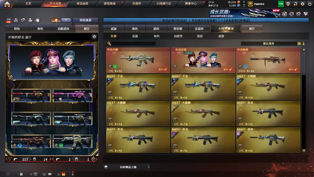 号确实不错,主流爆破武器都带皮肤带音效卡,*防人物也很多,雷套装也不少,手枪也有好几把,总之体验感很好,下次还会再来租
