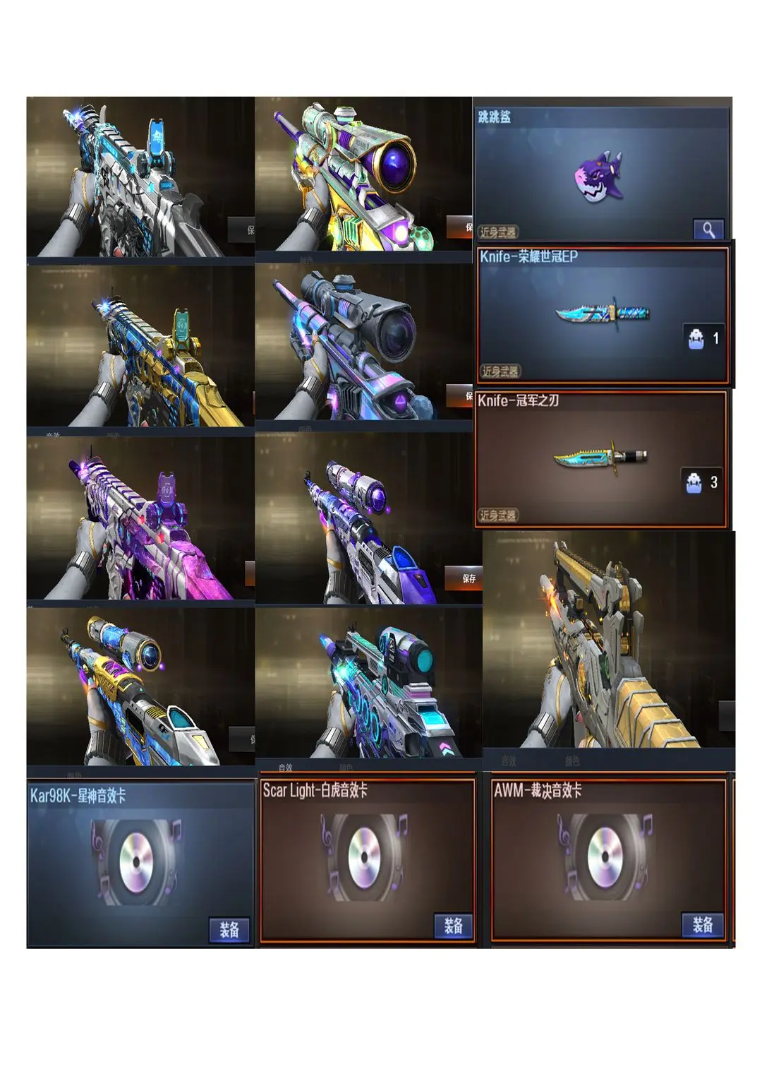 本游戏账号:英雄武器400+; 装备不多,但是主武器、副武器、近身武器够用 拥有完美游戏体验。特殊装备有:玄豹套装、usp冥王×3、炼狱泡泡象(赋予卷)、鲨鱼副武器近身武器。传说幽瞳、传说幽冥、传说女帝、传说暗裔、传说圣域、传说星骇、Kar98K-星神、M200-幻神、USP-雷暴、COP 357-幻灵、王者cop、王者usp、加特林-炼狱、M4A1-雷神、QBZ03-金色蔷薇、COP-堕天使、HK417-朱雀、荣耀世冠-柯尔特、荣耀世冠-雷神、M200-竞技荣光、柯尔特-竞技荣光、Barrett-雷霆王者-觉醒版、全音效、王者潘多拉等,随意畅选。
