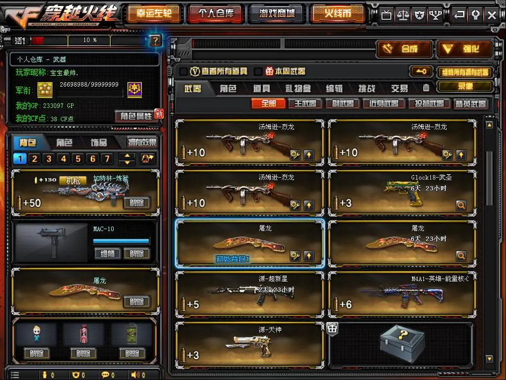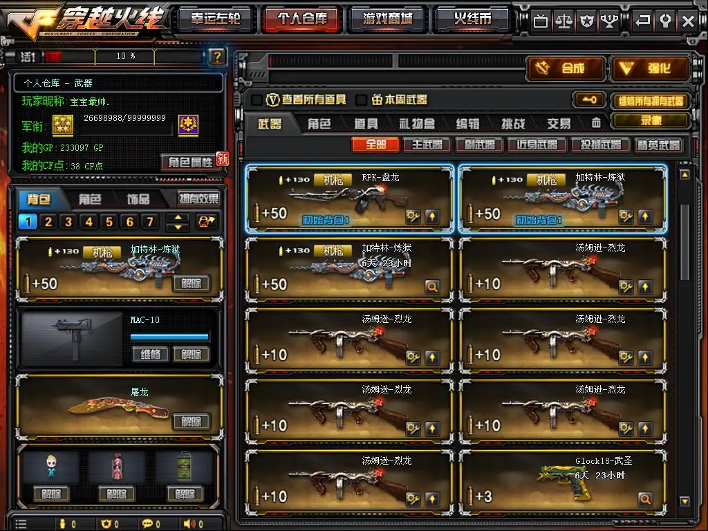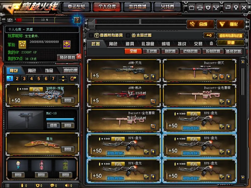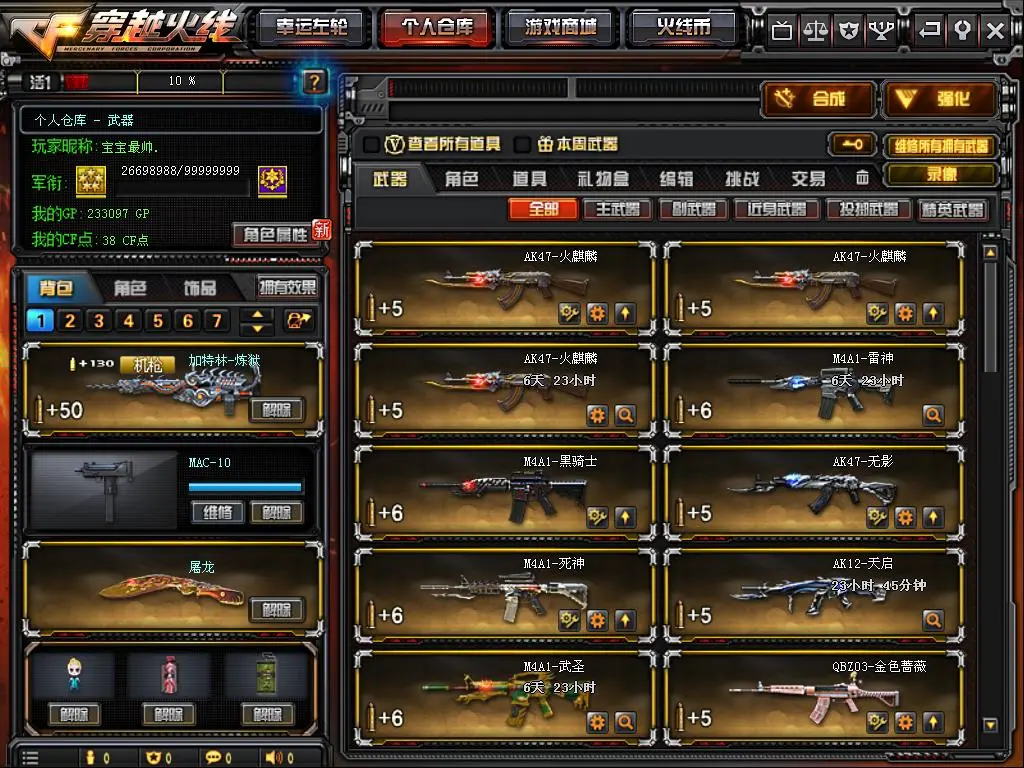 本游戏账号:英雄武器32个; 王者武器4个。 装备不多,但是主武器、副武器、近身武器够用 拥有完美游戏体验。重要的是,特殊装备有:极品至尊60V葵6烈龙6盘龙炼狱7步王者炫金生化爆破全装天花板等,随意畅选。