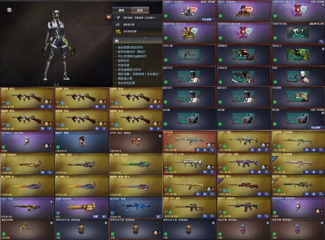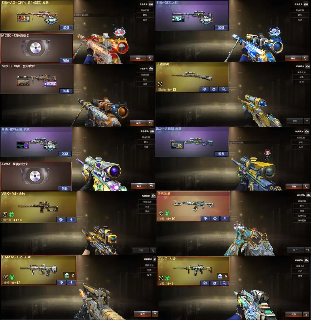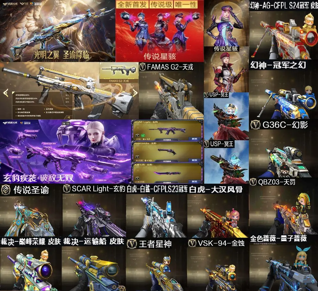 装备道具:传说星骇/传说圣谕★幻神-AG-CFPL S24冠军 皮肤/M200-幻神-黄忠皮肤/幻神-冠军之幻/毁灭-百城浙江 皮肤/巴雷特SV皮肤★雷神-R.LGD-CFPLS18冠军/雷神-航星皮肤/裁决-运输船 皮肤/裁决-巅峰荣耀 皮肤/金色蔷薇-量子蔷薇 皮肤/白虎-白鲨-CFPLS23冠军/白虎-大汉风骨/幻神音效卡/天罚音效卡/黑骑士音效卡/火麒麟音效卡/裁决音效卡/炼狱-百战金芒-庆典舞曲音效卡★SCAR Light-玄豹/G36C-幻影/FAMAS G2-天戎/金色蔷薇-古蛇迷踪/王者芳薇-觉醒版/Scar Light-白虎/白虎-电玩蓝兔/QBZ03-天罚(2)/QBZ03-金色蔷薇//VSK-94-金蚀/炼狱-百战金芒/Anaconda-玄豹/USP-冥王(2)/王者冰锋/王者星神-觉醒版/COP 357-幻灵//玄豹套装★影豹/鹰/_晴雅/隼/_岚兮儿/机械姬/王者影豹/王者潘多拉/HK417-朱雀-蛇隐宗/异变清道夫-蛇影双骄/斯泰尔-蝴蝶/★佣兵觉醒手斧镜减速雷★捕食者之眼超级对讲机不退包★超级背包无需换弹查看血量