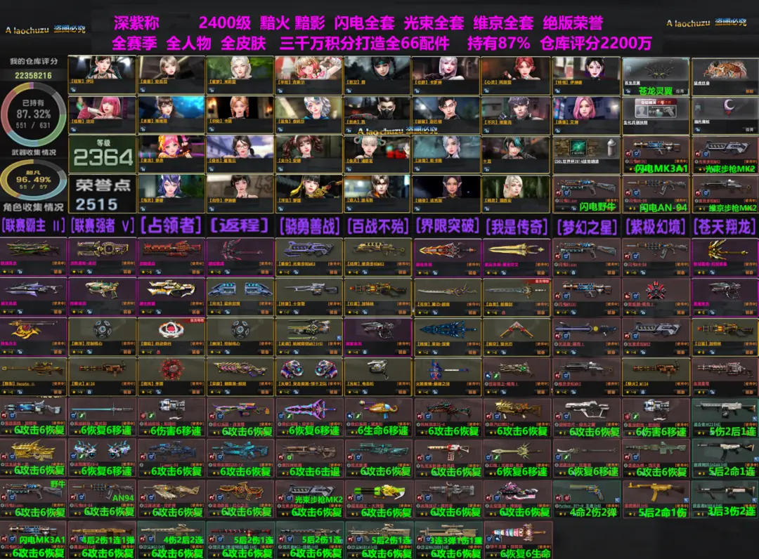 网一深紫称,2600级。荣誉2800点,很多绝版荣誉称号。光束步枪123、维京步枪全套、闪电MK3A1、闪电野牛、AN94。6保底(黯火、特典狙-黯影、月光蓝色幻想、歼星十字弩、日冕加特林、煌炎X12)。23个赛季全满。全人物。超多皮肤枪。持有88%,仓库评分2200万,极品强化。3千万积分打造顶级配件。