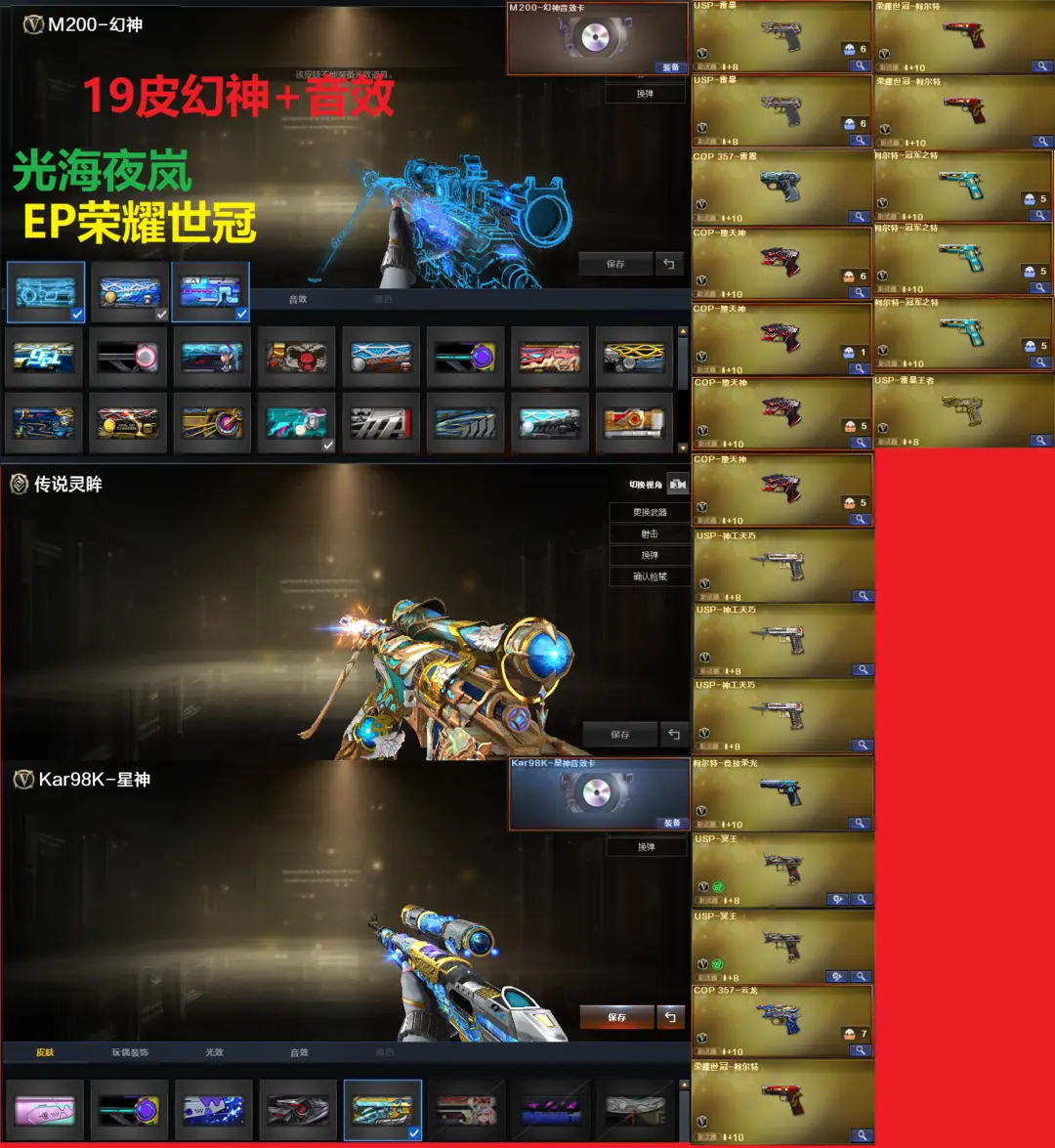 排位:可以---生化四防全装极品(生化模式换背包、看血量):无需换弹15烈龙、10盘龙、炼狱+音效、炼狱-泡泡象、斯太尔蝴蝶、异变清道夫-小人枪、MK5-炽火炎龙、MAC涂鸦、炽芒蝶刃、手斧镜、炽芒蝶刃、3个生化减速雷、超级对讲机、弹匣都有、、、爆破四防:3把幻神19皮+音效(光海夜岚、荣耀世冠EP、电竞之星、传奇欧欧、24AG冠军、23白鲨、星火小队、幻神-Heartshot皮肤、电流骇客、星耀、白鲨、N9、巅峰荣耀、冠军之幻、AG、周瑜、宠儿、曹操、2022皮肤)传说灵眸、M200-竞技荣光、王者幻神、98K星神、2个USP雷暴、3个USP神工天巧、USP雷暴、2个USP冥王、COP雷霆、4个COP堕天神、柯尔特竞技荣光、COP云龙、3个世冠柯尔特、3个冠军之特、传说圣谕、传说暗裔、天戎、传说圣谕、G36幻影、白虎、、、幻神音效、裁决音效、星神音效、蔷薇音效、雷神音效、毁灭音效、玄武音效、炼狱音效、火麒麟音效、黑骑士音效、、、全手雷、、、生化四防(传说影煞、王者雾萌萌)、爆破四防(传说女帝、传说星骇、传说艾莉莎、云悠悠、晴雅、雾萌萌、雨墨、岚兮儿、王者潘多拉、王者炽天使)