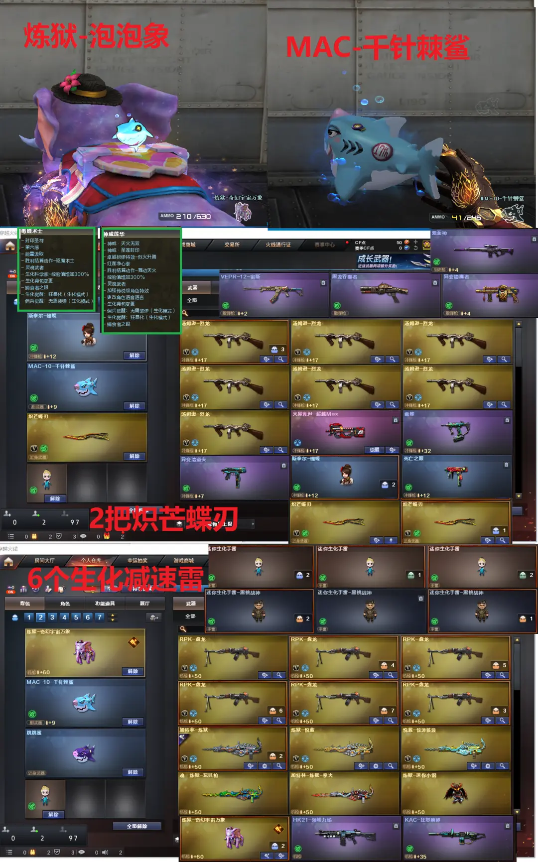 排位:可以、、、、、、、、、、生化四防全装极品(可以变更背包、查看生化僵尸血量):无需换弹、6烈龙、6盘龙、3炼狱、炼狱-泡泡象、炼狱小刚、毒蜂、斯太尔蝴蝶、八面凌龙、传说圣灵、VPER-12-宙斯、异变清道夫、异变镇魔者、KAC-狂怒咆哮、双面神、领域力场、死亡之眼、MAC-千针棘鲨、MAC-10龙宝、、2把炽芒蝶刃、手斧镜、6个生化减速雷、超级对讲机、全部弹匣、、、、、、爆破四防:幻神2皮(电竞之星、电流骇客皮肤)、M200-竞技荣光、98K星神、、、、USP雷暴、2个COP堕天神、2个COP幻灵、柯尔特竞技荣光、、、、加利尔ACE-天袭、G36幻影、FAMAS G2-天戎、白虎、QBZ金色蔷薇、、、、裁决音效、蔷薇音效、、、3套堕天神、3套夜魔、7套电竞装甲、7套幻灵、3套竞技荣光、、、生化四防(神威莲华、毒蝰术士、沙漠玫瑰、职业经理)、爆破四防(云悠悠、影豹、王者貂蝉)