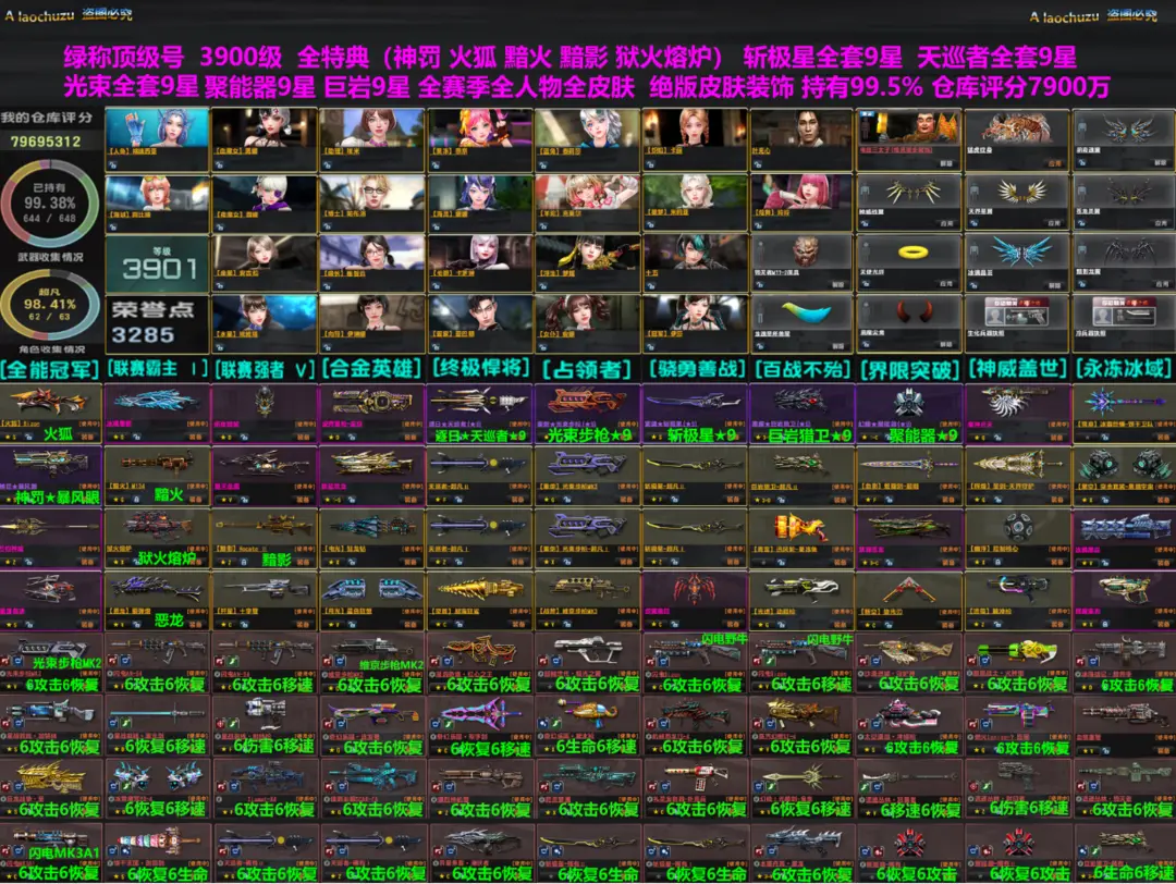 网通一区超超极品,22季全满。高等级浅绿称全装号,3800级,荣誉3000点,全能冠军。很多绝版荣誉,绝版皮肤,绝版三太子,绝版称号。全神全霸全传奇。金鲨、聚能器+9、巨岩+9,斩极星全套+9。天巡者全套+9。光束步枪全套+9。维京步枪全套、闪电MK3A1、闪电野牛、闪电AN-94、全部保底(神罚暴风眼、火狐、狱火熔炉、黯火、恶龙、黯影、狂龙钻、月光等)。全塞季、全人物、全部皮肤枪。武器持有99.4%,人物持有98%,仓库评分4500万,绝版武器,极品强化。5000万积分打造极品双66配件。