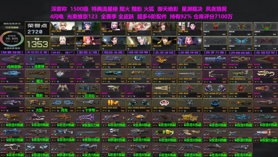 网通一区,深紫称,荣誉2750点,1500级。24季全满。特典流星锤、黯火、黯影、火狐等。传奇只差万钧神威,其它传奇都有。光束、维京步枪123。4闪电。特典保底有(雷索流星锤、火狐、黯火、黯影、狂龙钻、月光、歼星、弧光、日冕等)。全塞季、全部皮肤枪。武器持有92%,仓库评分7100万,超多绝版武器。大部分都是66配件,部分5阶配件(5阶配件会持续更换到6阶配件)。