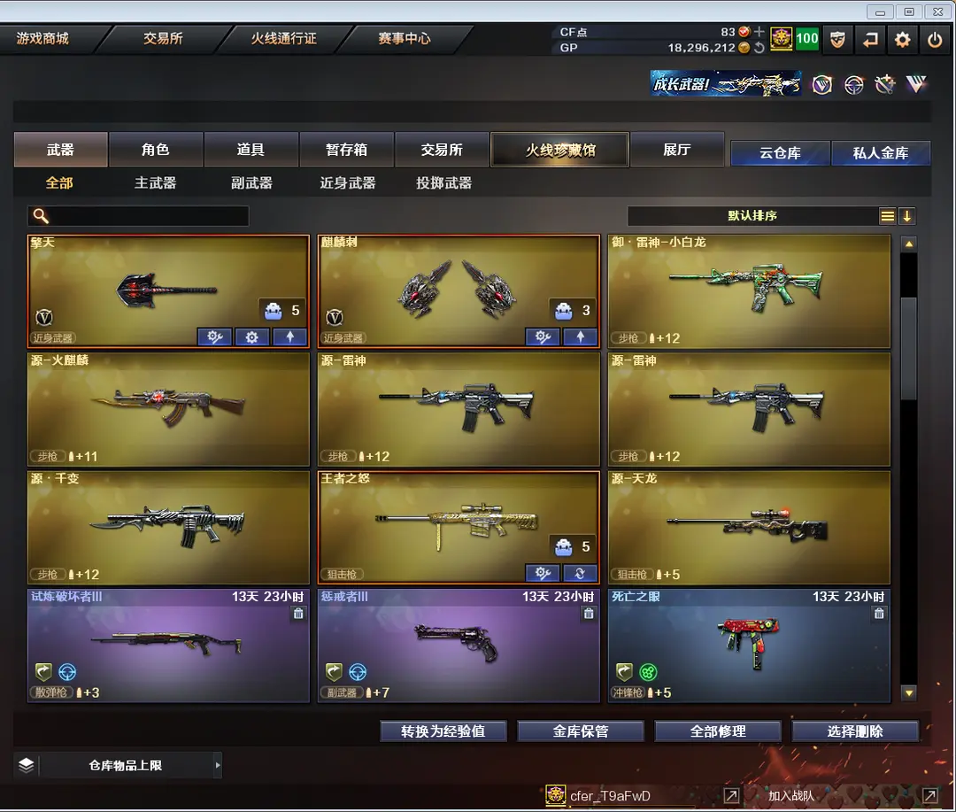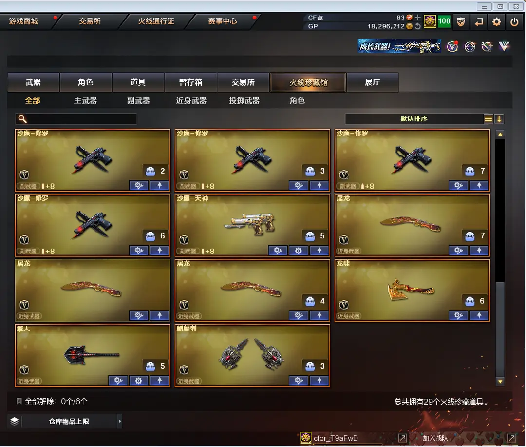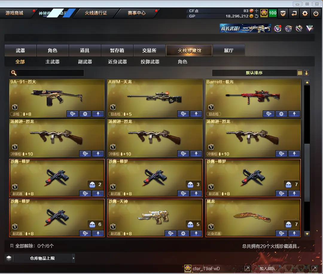 传奇2英雄武器】:【M4A1-死神-2,AK12-天启-1,M4A1-千变-1,M4A1-玫瑰精灵-1,屠龙-3,龙啸-1,AK47-无影-1,麒麟刺-1,AK47-火麒麟-1,AWM-天龙-1,汤姆逊-烈龙-3,Barrett-极光-1,沙鹰-修罗-4,沙鹰-天神-1,M4A1-雷神-1,M4A1-黑龙-1,9A91-烈火-1,擎天-1】