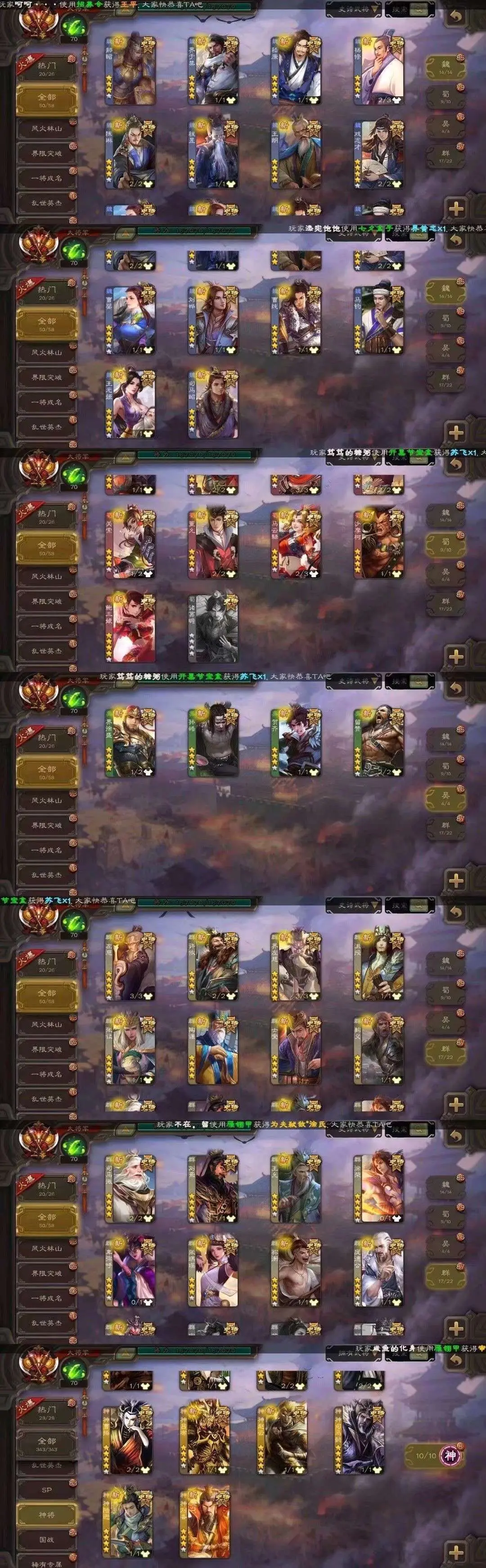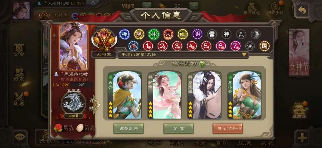 110个四星77个动皮,史诗武将看截图!常用的都有!特别适合国战玩家!VIP22,国战将全部满星!!!最强国战号!!!四星将动皮可见截图!请新老客户收藏!!!新增动态王元姬动皮!目前还有点将卡一千多,手气卡没了,有卡时候是13一小时这个价格自己买卡都划算!不要恶意逃跑就行谢谢!没杜预没杜预