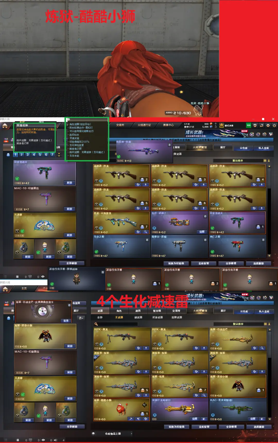 排位:可以----------生化四防(可以变更背包、看僵尸血量)无需换弹、6烈2盘、6炼狱、炼狱-酷酷小狮、炼狱小刚、异变清道夫、VSK-94-金蚀、死亡之眼、手斧镜、4个生化减速雷、生化弹匣、全部弹匣、、、、、、、爆破四防:幻神3皮+音效(宠儿、N9、丹凤皮肤)、M200-竞技荣光、98K星神、98K-量子之心、、、、、USP雷暴、USP神工天巧、2个USP冥王、量子之心左轮、COP堕天神、COP幻灵、柯尔特竞技荣光、、、、QBZ幻兽、玄豹白虎、QBZ金色蔷薇、、、幻神音效、裁决音效、幻影音效、雷神音效、毁灭音效、炼狱音效、黑骑士音效、、、5套幻兽、2套夜魔、3套幻灵、3套竞技荣光、1套神工天巧、1套云龙、2套玄豹、1套雷霆王者、、、生化四防(隼、玫瑰花神)、爆破四防(王者潘多拉、云悠悠、机械姬、玄豹)