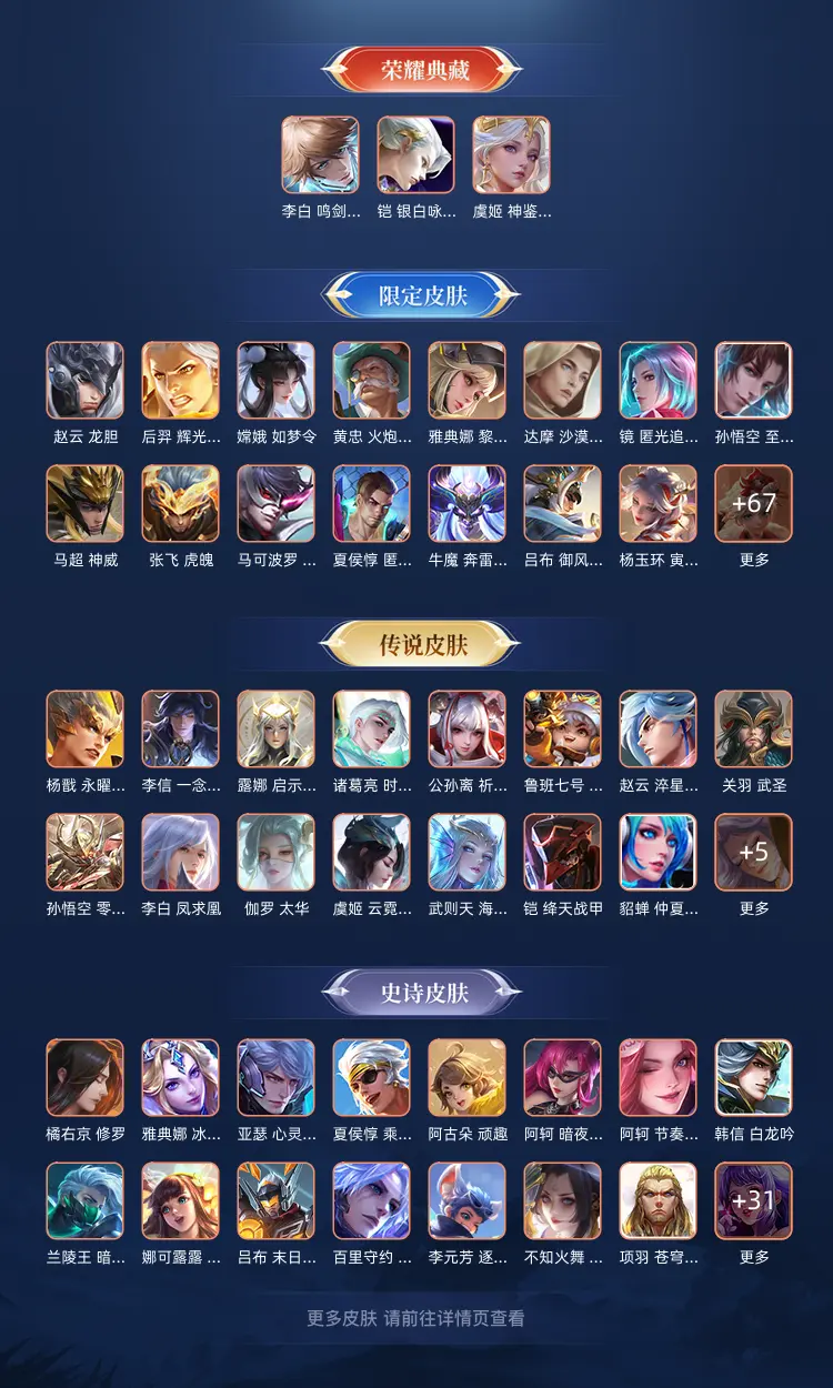 本游戏账号: ,英雄多,皮肤多。典藏皮肤3个,感受典藏皮肤带来的优质体验快感,FMVP皮肤6个,尽情享受FMVP皮肤带来的主角光环, 私人所属英雄皮肤有:虞姬 神鉴启示录||铠 银白咏叹调||李白 鸣剑·曳影诸葛亮 时雨天司||诸葛亮 武陵仙君||孙悟空 零号·赤焰||桑启 鸣野蒿||后羿 千劫归真||虞姬 云霓雀翎||虞姬 启明星使||武则天 海洋之心||貂蝉 仲夏夜之梦||澜 愿照·九州拓||张良 黄金白羊座||孙策 乘龙·淬吴钩||赵云 淬星耀世||赵云 乘龙·铭钟鼎||鲁班七号 寅虎·瑞焰||艾琳 觅芳踪||露娜 启示之音||裴擒虎 寅虎·赤拳||马超 琥珀纪元||铠 绛天战甲||云缨 幻光神枪||公孙离 祈雪灵祝||伽罗 太华||兰陵王 默契交锋||杨戬 永曜之星||达摩 黄金狮子座||孙尚香 乘龙·问璇玑||关羽 武圣||李信 一念神魔||李白 凤求凰,等等