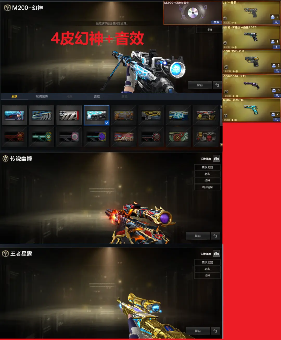 排位:可以、、、、、、、、、、、、、爆破四防:4皮幻神音效(23白鲨、电流骇客、星耀、白鲨皮肤)、传说幽瞳、王者星神、USP雷暴、COP幻灵、23白鲨柯尔特、冠军之特、玄豹左轮、G36幻影、加利尔ACE-天袭、FAMAS G2-天戎、白虎、QBZ冠军之薇、炽芒蝶刃、、、幻神音效、白虎音效、、、1套雷霆、1套雷暴、1套幻了、2套竞技荣光、8套玄豹、、、爆破四防(鹰、云悠悠、机械姬、玄豹、隼、女主播)