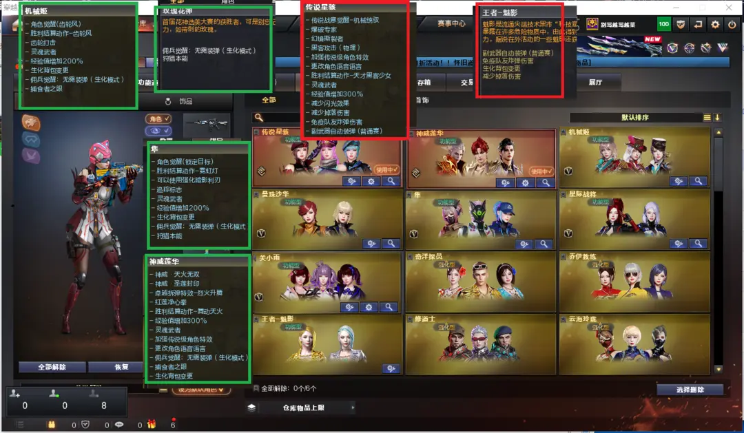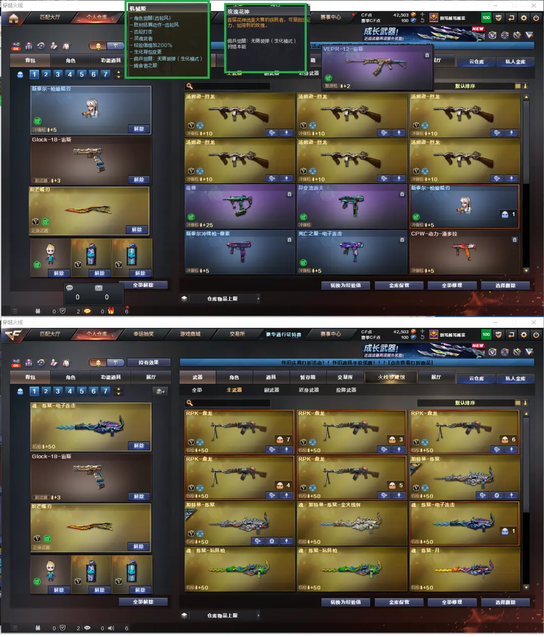 排位:可以、、、、、毒蜂+清道夫可以卡无限子弹、、、、、生化全装(生化背包更换、可以看僵尸血量):无需换弹、6烈龙、5盘龙、2炼狱、斯泰尔蝴蝶枪娘暗刃、VPER-12-宙斯、异变清道夫、毒蜂、死亡之眼、MAC-涂鸦、炽芒蝶刃、手斧镜、生化减速雷、全部弹匣、、、、、、、、、、、爆破四防:幻神2皮(星耀、电流骇客皮肤)、98K星神、、、、、2个USP雷暴、、、、G36幻影、传说夜影、FAMAS G2-天戎、QBZ191-银翼、白虎、王者凌虎、QBZ金色蔷薇、、、星神音效、白虎音效、蔷薇音效、雷神音效、、、2套竞技荣光、、、生化人物(神威莲华、隼、机械姬、玫瑰花神)、爆破四防(传说星骇、王者魅影)