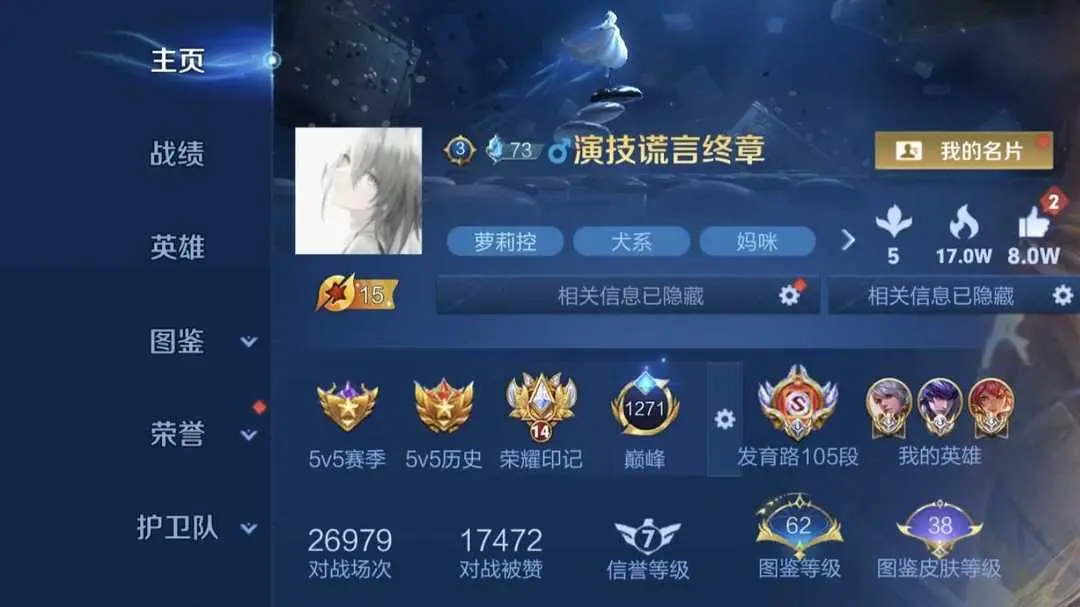 本游戏账号: V5用户,基础段位:至尊星耀I,英雄虽然少,应该有你喜欢的英雄。,皮肤多。FMVP皮肤1个,尽情享受FMVP皮肤带来的主角光环, 私人所属英雄皮肤有:达摩 黄金狮子座||孙尚香 末日机甲貂蝉 猫影幻舞桑启 海盐诗旅||达摩 沙漠行僧||鲁班大师 乓乓大师||关羽 冰锋战神||狄仁杰 阴阳师||狄仁杰 魔术师||赵云 皇家上将||项羽 海滩派对||元歌 云间偶戏||亚瑟 潮玩骑士王||裴擒虎 李小龙,等等
