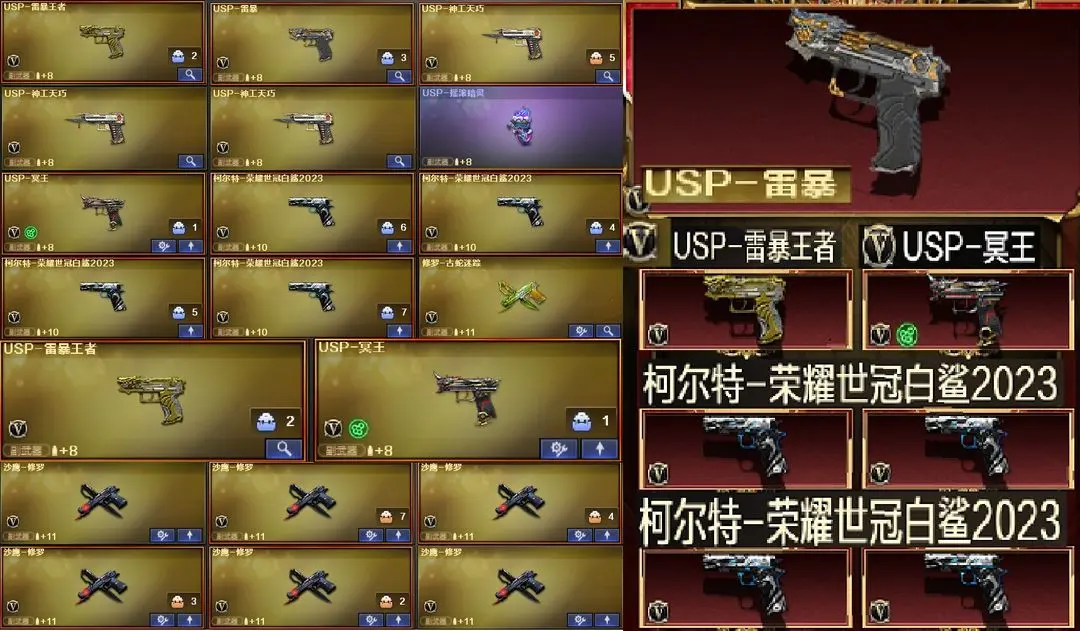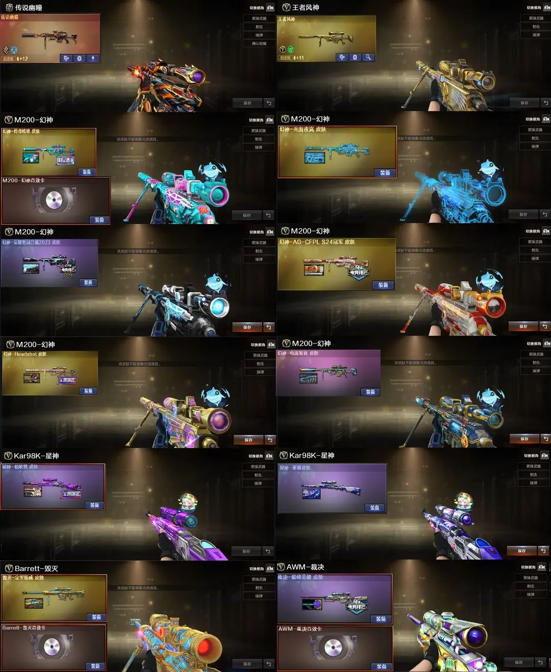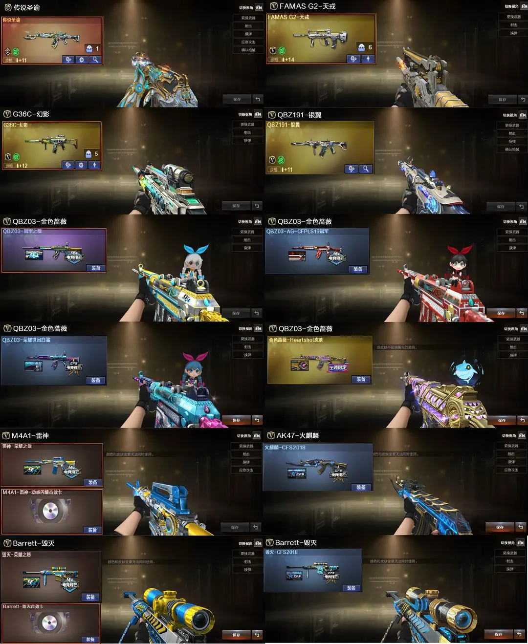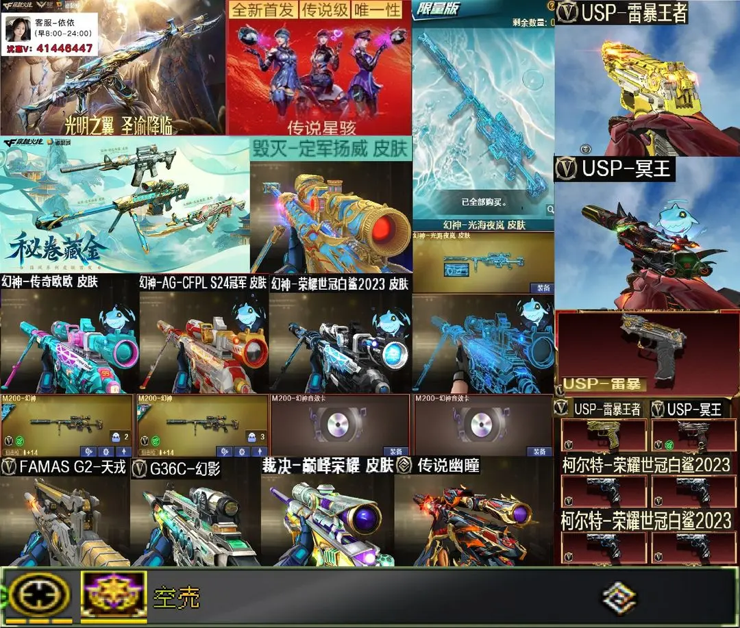 【装备道具】传说圣谕/传说幽瞳(2)/传说艾莉莎/传说星骇/❤幻神-光海夜岚 皮肤/幻神-Heartshot/幻神-电流骇客/幻神-AG-CFPL S24冠军/幻神-欧欧/幻神-荣耀世冠白鲨2023/星神-枪娘默/星神-璀璨/雷神-冠军之魄/雷神-白鲨雷神-炽焰魔龙雷神-仲达白露/毁灭-定军扬威/裁决-巅峰荣耀/巅峰荣耀火麒麟-玉面羞花 /金色蔷薇-Heartshot/白虎-白鲨-CFPLS23冠军/QBZ03-AG-CFPLS19冠军/QBZ03-荣耀世冠白鲨/QBZ03-冠军之薇/炽芒蝶刃-荣耀世冠白鲨2023/FAMAS G2-天戎/死神-雪域霜狐/G36C-幻影/QBZ191-银翼游侠/USP-雷暴/USP-神工天巧(3)/白虎-电玩蓝兔/白虎之魄/QBZ03-天罚7把❤王者风神-觉醒版/炼狱-百战金芒音效卡/USP-冥王/柯尔特-荣耀世冠白鲨2023(4)❤双幻神音效卡/天罚音效卡/白虎音效卡毁灭音效卡/裁决音效卡/极光音效卡/❤王者玄武/USP-雷暴王者/王者冰锋❤炼狱-迷你小钢/异变清道夫-蛇影双骄/斯泰尔-枪娘暗刃/USP-摇滚暗灵/炼狱-秦师/晴雅/隼/机械姬/隐