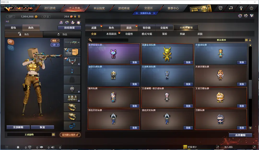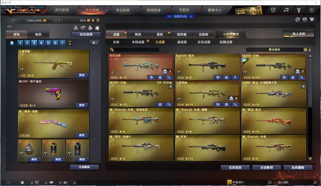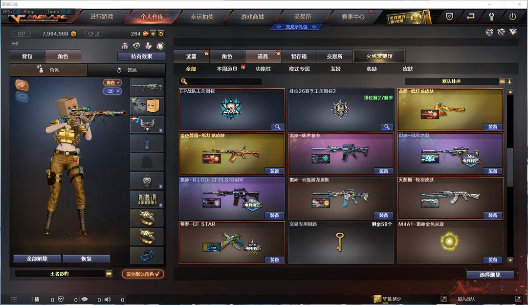 传说灵眸 王者风神(觉醒) 王者芳薇(觉醒) M200-幻神 幻神-冠军之幻皮肤 金色蔷薇-纸灯龙皮肤 雷神-脉冲核心 雷神-R.LGD-CFPLS18冠军皮肤 火麒麟-轻羽皮肤 龙啸-纸灯龙皮肤 多光效玩偶 幻灵套装 灵狐者-职业经理 王者影豹 激光毁灭者3 迷你深渊冰龙-王绿豆 5王者炫金 8皮肤 11步枪 5狙 5副 7近身 15雷 5角色 稀有武器等等。请素质租号,文明游戏,谢谢大家配合!!!