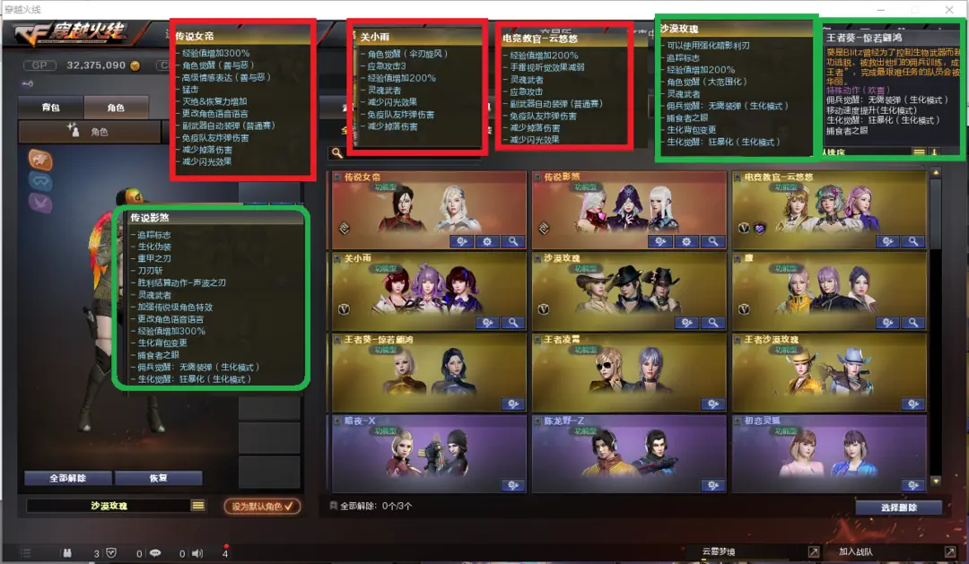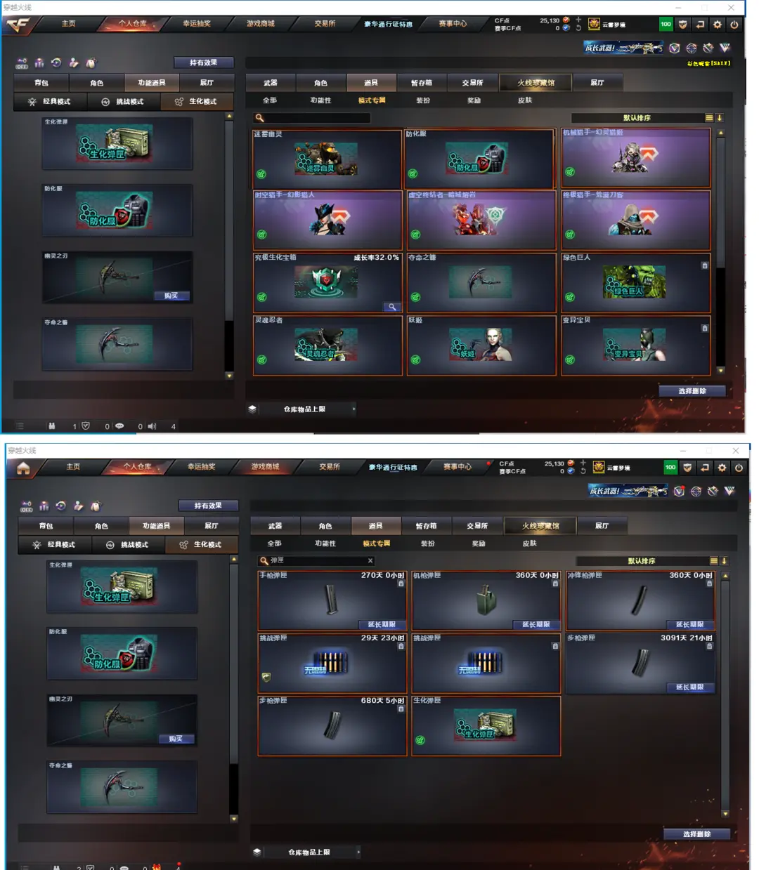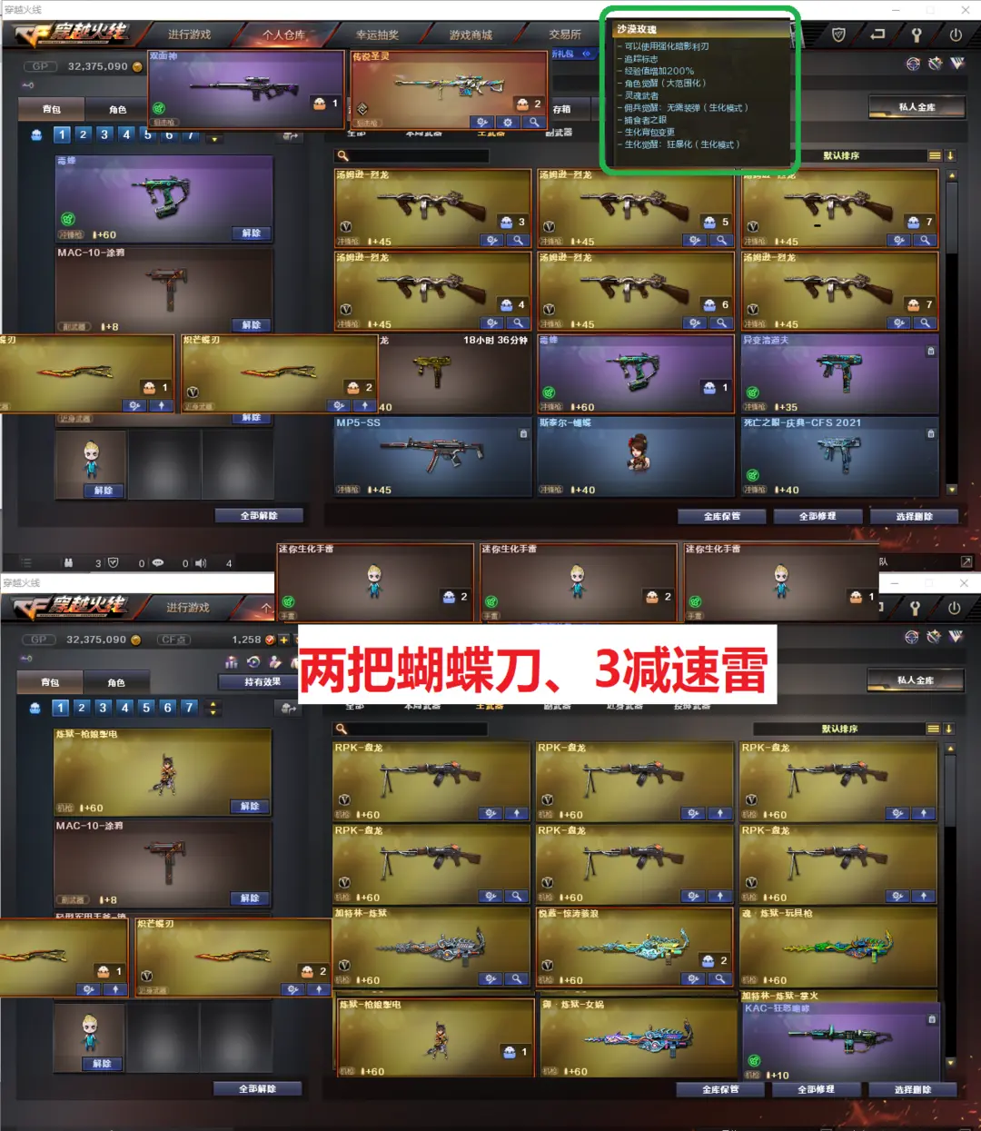 排位:可以-----------------生化全装(换背包、看僵尸血量):无需换弹、6烈6盘、炼狱惊涛骇浪、传说圣灵、双面神、KAC狂怒咆哮、毒蜂、异变清道夫、斯泰尔蝴蝶、MAAC手枪、2把炽芒蝶刃、3个减速雷、超级对讲机、全部弹匣、、、、、爆破全装:幻神3皮肤(宠儿、N9、黄忠)、王者星神、传说圣灵、、、USP雷暴、USP神工天巧、柯尔特竞技荣光、、、、G36C幻影、传说暗裔、QBZ金色蔷薇、白虎、、、、1套雷霆、4套雷暴、2套竞技荣光手雷、、、、生化人物(沙漠玫瑰、传说影煞、王蛇惊若翩鸿)、爆破四防(传说女帝、关小雨、云悠悠、鹰)