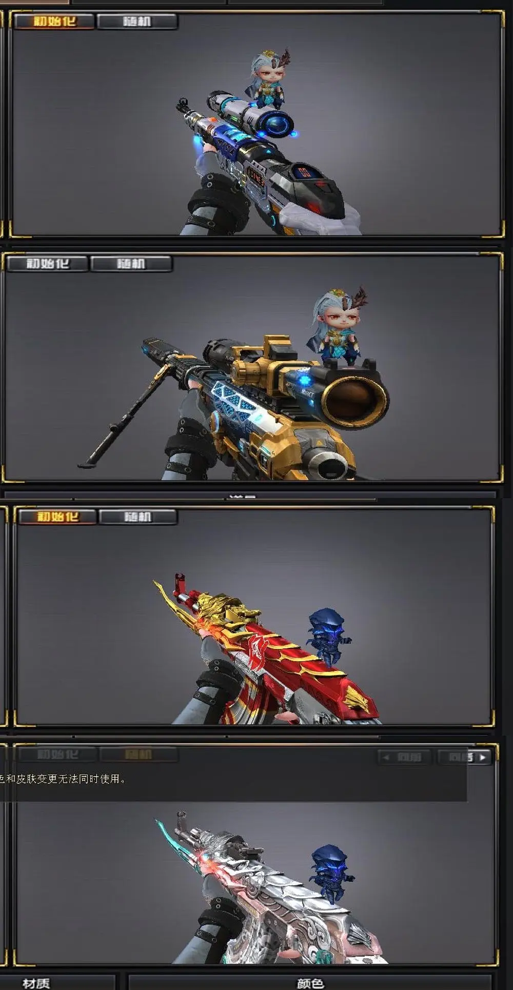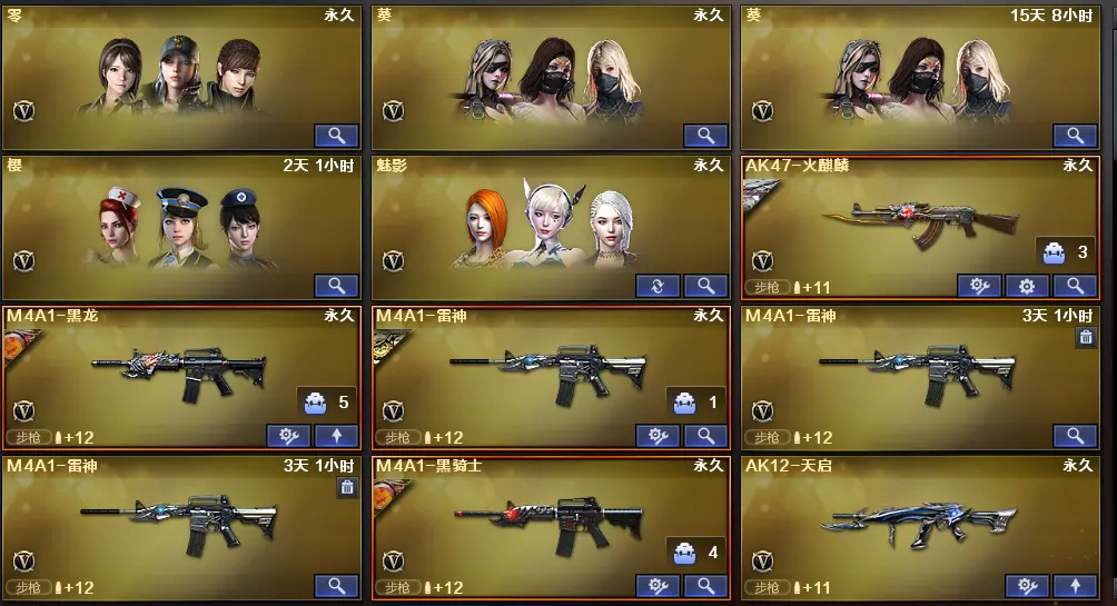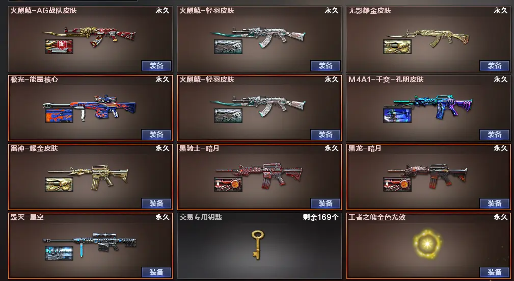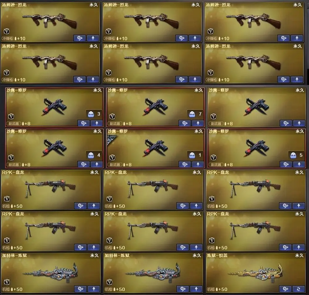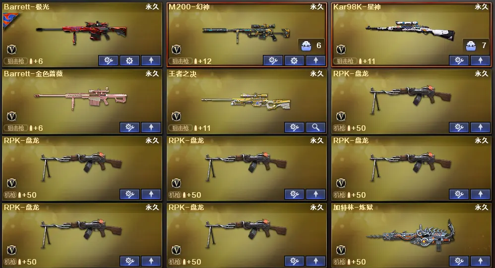 【AK12-天启,M4A1-千变,破空枪刃,M4A1-黑骑士,M4A1-玫瑰精灵,屠龙,龙啸,AK47-火麒麟,AWM-天龙,Barrett-毁灭,汤姆逊-烈龙,Barrett-极光,RPK-盘龙,沙鹰-修罗,加特林-炼狱,沙鹰-天神,M4A1-雷神,M4A1-黑龙,9A91-烈火,M4A1-夜魔,高爆手雷-夜魔,马来剑-夜魔,破空枪刃-夜魔,闪光弹-夜魔,烟雾弹-夜魔,AA-12-雷霆,HK417-朱雀】