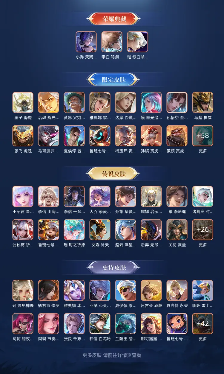 本游戏账号,英雄多,皮肤多。,感受典藏皮肤带来的优质体验快感,尽情享受FMVP皮肤带来的主角光环 私人所属英雄皮肤有:李白 鸣剑·曳影||小乔 天鹅之梦百里守约 碎云||蔡文姬 花朝如约||达摩 黄金狮子座||狄仁杰 超时空战士||狄仁杰 神器·狴犴令||貂蝉 仲夏夜之梦||后羿 黄金射手座||铠 绛天战甲||李白 诗剑行||李元芳 飞鸢探春||马可波罗 深海之息||孙尚香 末日机甲||孙尚香 音你闪耀||王昭君 乞巧织情||小乔 音你心动||张良 黄金白羊座||周瑜 音你心动||孙策 末日机甲||上官婉儿 神器·万象笔,等等