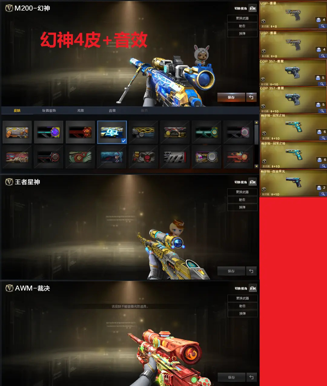 排位:可以、、、、、、、、、、、、爆破四防:幻神4皮+音效(冠军之幻、巅峰荣耀、丹凤、黄忠皮肤)、王者星神、M200-竞技荣光、、、、2个USP雷暴、2个COP雷霆、柯尔特竞技荣光、2个冠军之特、、、、传说辉光、传说圣灵、白虎、G36幻影、QBZ金色蔷薇、黄金猫猫手套、、、幻神音效、蔷薇音效、毁灭音效、雷神音效、火麒麟音效、、、4套雷暴、3套电竞装甲、2套竞技荣光、、、爆破四防(传说女帝、王者惊若翩鸿、王者沙漠玫瑰、云悠悠鹰)