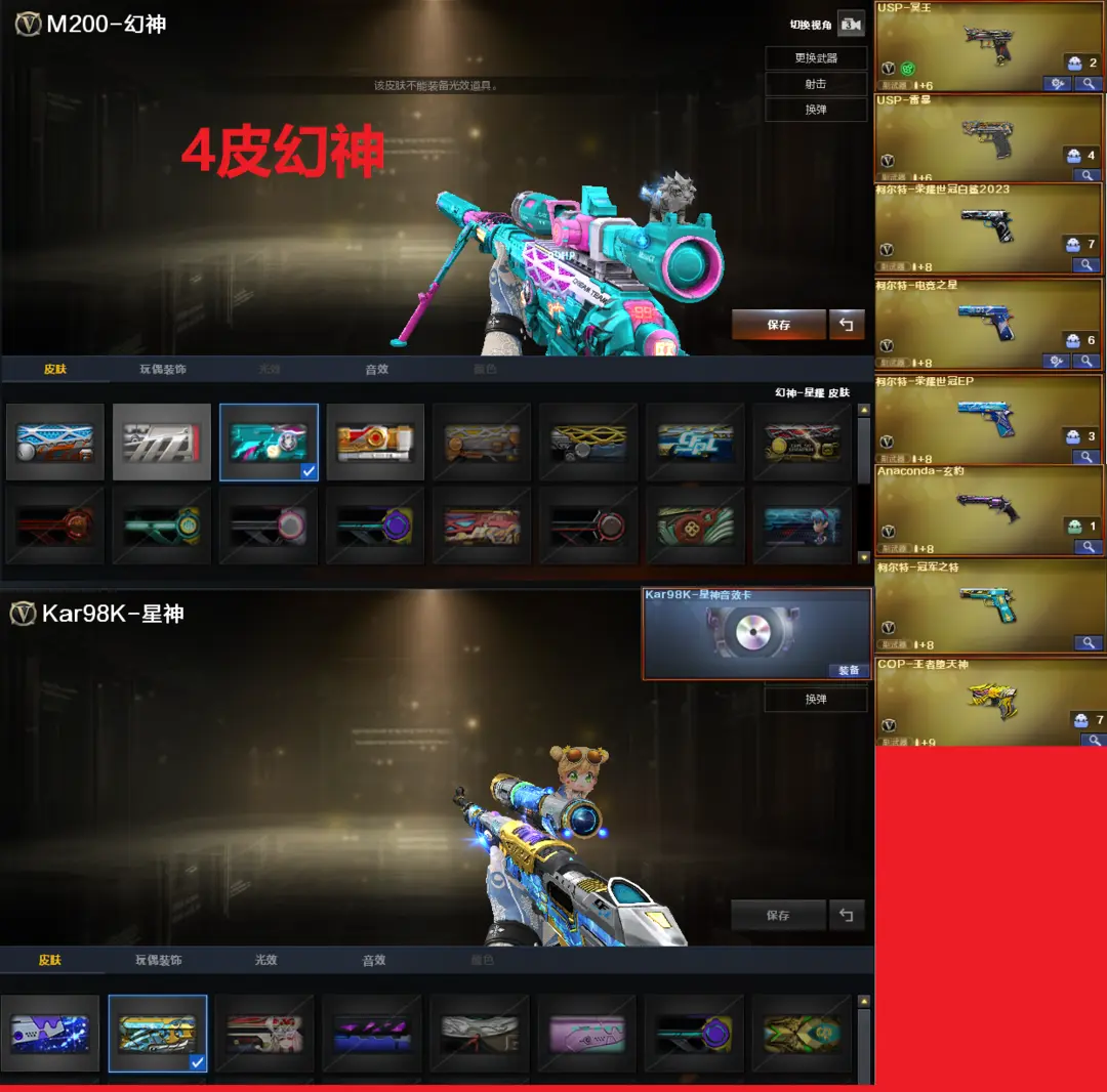 排位:可以、、、、、、、、、、、爆破四防:幻神4皮(传奇欧欧、24AG冠军、星火小队、星耀皮肤)、98K星神、、、、USP雷暴、USP冥王、23白鲨柯尔特、COP王者堕天神、柯尔特-电竞之星、柯尔特-EP荣耀、冠军之特、玄豹左轮、、、、G36幻影、王者凌虎、QBZ金色蔷薇、炽芒蝶刃、、、星神音效、蔷薇音效、毁灭音效、、、1套幻兽、5套玄豹、、、爆破四防(妮妮、曼珠沙华、王者魅影)