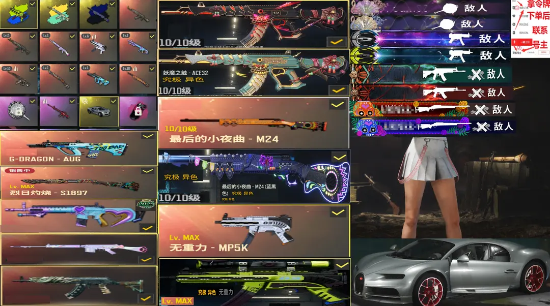 布加迪威龙新皮✅⑩M24异色小夜曲⑩ACE妖魔满级MP5异色烈日玩偶魔女AUG青龙黑人烟雾柏林可排位