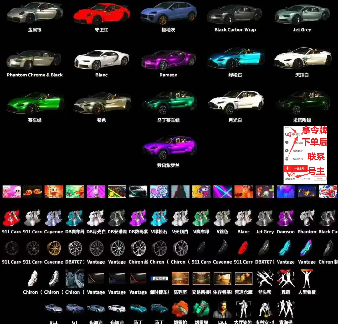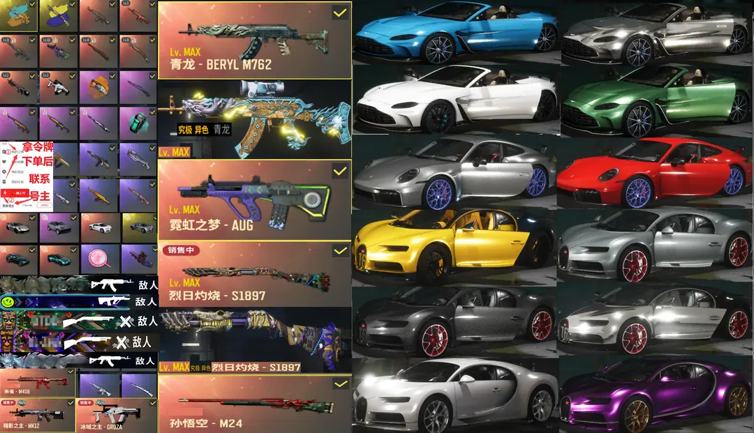 30跑车布加迪保时捷✅⑩异色青龙M762金龙⑩霓虹AUG⑩异色烈日S189悟空小丑柏林战神尼尔可排位