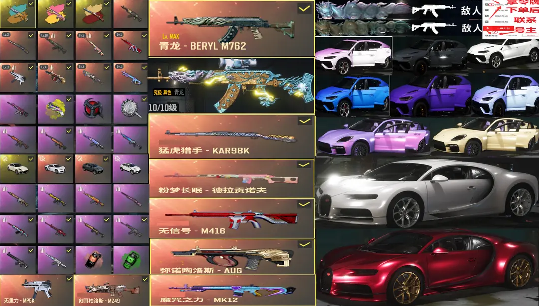 满神器满车布加迪威龙保时捷兰博基尼✅⑩金龙异色青龙M762AUGMP5猛虎信号魔女黑人帕拉梅拉可排位